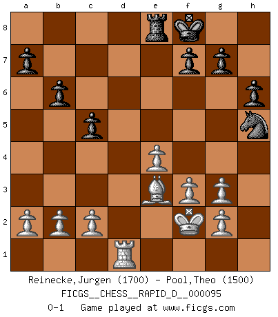 Last move : 0-1 2016 January 10 23:22:53 [Event "FICGS__CHESS__RAPID_D__000095"] [Site "FICGS"] [Date "2015.10.21"] [Round "1"] [White "Reinecke,Jurgen"] [Black "Pool,Theo"] [Result "0-1"] [WhiteElo "1700"] [BlackElo "1500"] 1.e4 e5 2.Nf3 Nc6 3.Bb5 d6 4.d4 exd4 5.Nxd4 Bd7 6.O-O Nf6 7.Re1 Nxd4 8.Bxd7+ Qxd7 9.Qxd4 Be7 10.Nc3 O-O 11.Bg5 h6 12.Bf4 c5 13.Qd3 Ng4 14.Rad1 Rfd8 15.Nd5 Qe6 16.Nxe7+ Qxe7 17.Bxd6 Qh4 18.Qg3 Qxg3 19.hxg3 b6 20.Bf4 Rxd1 21.Rxd1 Re8 22.f3 Nf6 23.Kf2 Nh5 24.Be3 Kf8 0-1 This chess game has been lost on time (started : 2015.10.21 15:17:38) Ruy Lopez : Old Steinitz defense Kingside Castling by player White (move 6) Kingside Castling by player Black (move 10) Player Black won this chess game. Follow this game move after move (download)There are tough players and nice guys, and I'm a tough player. (Bobby Fischer) Jeder leidlich begabte Spieler, er braucht keineswegs hervorragend veranlagt zu sein, kann es zum Meister bringen. Aber das ist ja auch gar nicht nötig! Der richtige Standpunkt ist es, zu seinem Vergnügen zu spielen, und man glaube ja nicht, dass der Genuss proportional dem Können sei. (Siegbert Tarrasch) Alekhine es un poeta que crea un trabajo de arte de algo que raramente inspiraría a otra persona a mandar una tarjeta postal. (Max Euwe) J'ai vu le vaincu d'Echecs jouer des années durant dans l'espoir de la fête de la victoire. Car tu es plus riche de ce qu'elle existe si même elle n'est point pour toi. Ainsi de la perle du fond des mers. (Antoine de Saint-Exupéry) I have opinions of my own - strong opinions - but I don't always agree with them. (George Bush)
