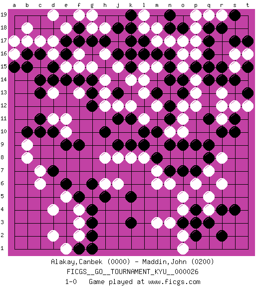 Last move : 1-0 2007 September 18 2:49:28 [Event "FICGS__GO__TOURNAMENT_KYU__000026"] [Site "FICGS"] [Date "2007.03.14"] [Round "1"] [Black "Alakay,Canbek"] [White "Maddin,John"] [Result "1-0"] [Rating 1 "0000"] [Rating 2 "0200"] 1.r15 d4 2.p3 d16 3.r4 r13 4.q17 c6 5.f17 e18 6.c16 d17 7.c14 b17 8.h17 g18 9.f18 f19 10.g17 h18 11.j18 g19 12.k17 c17 13.k3 m3 14.k5 o4 15.o3 n3 16.p4 o5 17.r10 r8 18.q9 p8 19.q8 q7 20.p7 p6 21.o7 o8 22.n7 m6 23.n9 n8 24.m8 m7 25.o9 n6 26.p9 r6 27.q14 p12 28.n15 m17 29.l16 o16 30.o14 p18 31.q18 p17 32.q16 l18 33.n12 r11 34.s11 s12 35.q11 r12 36.s10 s15 37.s14 s16 38.r14 p14 39.p15 p13 40.s17 n13 41.o13 o15 42.m13 p16 43.q15 q19 44.r18 r19 45.s19 p19 46.n18 n17 47.o18 t14 48.t13 o11 49.n11 q5 50.s4 q4 51.q3 o2 52.p2 o1 53.r2 t12 54.t15 m15 55.m16 l14 56.n16 o17 57.l17 m18 58.k18 l19 59.n19 j15 60.d15 f16 61.e17 d19 62.e16 f15 63.c11 d13 64.c13 d11 65.d10 e11 66.c10 b9 67.f9 h8 68.g4 f3 69.g3 f4 70.h10 h12 71.e14 f13 72.f14 g15 73.g14 h14 74.j16 h16 75.g13 h13 76.g12 e10 77.e9 l11 78.j9 j8 79.k9 k8 80.l9 l8 81.g2 f2 82.f1 e1 83.g1 d2 84.g6 h6 85.h5 j6 86.b10 b8 87.b16 a16 88.a15 a17 89.b15 l13 90.j11 j12 91.k11 k12 92.k15 k14 93.j13 e15 94.d14 t16 95.t17 m12 96.n14 n10 97.m10 o10 98.l10 o12 99.k19 l15 100.k16 b18 101.d7 c7 102.f5 e5 103.e6 1-0 This go game has been lost on time (started : 2007.03.14 5:49:3) Here are the names of the openings (joseki) played in the four corners : Corner q16 : r15 r13 Mokuhazushi (Waemok, Wai`mu`) 5-3 Point. The mokuhazushi (5-3) point was popular in the Edo period in Japan (1600 - 1867). It emphasizes influence; territorially, it is inferior to the 3-4 point. Corner d16 : d16 f17 Hoshi (Hwajeom, Seongjeom, Xingwei`) 4-4 Point. The star or hoshi (4-4) point, emphasizing influence at the potential expense of territory. Ikken Kakari (Hankan Keolch'im, Yi Gua`jiao~, 1-Space Low Approach). Black 2 is the standard approach move to the 4-4. Player Black won this Go (weiqi, baduk) game. Follow this game move after move (download)Fighting must not be the key to go, it should be reserved as your last resource. (Zhong-Pu Liu, about Weiqi) A mistake is only a mistake if you let it happen twice. Otherwise it is a learning experience. (Daniel Parmet)