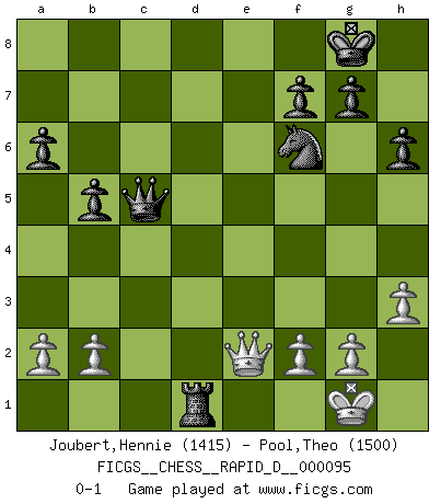 Last move : 0-1 2015 November 20 10:57:35 [Event "FICGS__CHESS__RAPID_D__000095"] [Site "FICGS"] [Date "2015.10.21"] [Round "1"] [White "Joubert,Hennie"] [Black "Pool,Theo"] [Result "0-1"] [WhiteElo "1415"] [BlackElo "1500"] 1.e4 e5 2.Nf3 Nc6 3.Bc4 d6 4.d4 exd4 5.c3 dxc3 6.Qb3 Qd7 7.O-O Na5 8.Qxc3 Nxc4 9.Qxc4 h6 10.Nc3 Nf6 11.Bf4 Be7 12.Rad1 O-O 13.e5 Nh5 14.exd6 cxd6 15.Be3 Re8 16.Ne5 Qf5 17.Nf3 Be6 18.Nd5 Bxd5 19.Rxd5 Qg6 20.Qb5 Nf6 21.Rd4 Ng4 22.Bf4 Reb8 23.h3 Nf6 24.Bxd6 Bxd6 25.Rxd6 a6 26.Qb3 b5 27.Rfd1 Qf5 28.Nd4 Qe5 29.Nc6 Qc5 30.Nxb8 Rxb8 31.Qd3 Re8 32.Rd8 Rxd8 33.Qe2 Rxd1+ 0-1 King's pawn game Kingside Castling by player White (move 7) Kingside Castling by player Black (move 12) Player Black won this chess game. Follow this game move after move (download)When you don't know what to do, wait for your opponent to get an idea - it's sure to be wrong. (Tarrasch) Offensichtlich kennt Kasparow nichts anderes als Schach, und ich könnte 500 weitere Spieler dieser Sorte benennen. (Judith Polgar) Fischer deseaba darle a los Rusos una sopa de su propia medicina. (Larry Evans) Si je n'étais pas joueur d'échecs, je serais le meilleur dans quelque chose d'autre. (Anatoli Karpov) Looking at the proliferation of personal web pages on the Net, it looks like very soon everyone on Earth will have 15 megabytes of fame. (M.G. Sriram)
