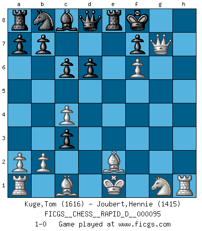 Last move : 1-0 2015 October 30 14:31:38 [Event "FICGS__CHESS__RAPID_D__000095"] [Site "FICGS"] [Date "2015.10.21"] [Round "1"] [White "Kuge,Tom"] [Black "Joubert,Hennie"] [Result "1-0"] [WhiteElo "1616"] [BlackElo "1415"] 1.c4 Nf6 2.Nc3 g6 3.e4 d6 4.Be2 Bg7 5.d4 O-O 6.g4 h6 7.h4 c6 8.g5 hxg5 9.hxg5 Nfd7 10.f4 e5 11.f5 gxf5 12.exf5 exd4 13.f6 dxc3 14.Qd3 Nxf6 15.gxf6 Re8 16.Qh7+ Kf8 17.Qxg7+ 1-0 English Opening Kingside Castling by player Black (move 5) Player White won this chess game. Follow this game move after move (download)The combination player thinks forward; he starts from the given position, and tries the forceful moves in his mind. (Emanuel Lasker) Verschiedene, sehr schätzbare und im Laufe des Lebens nützliche Eigenschaften des Geistes können durch das Schachspiel erworben und gekräftigt werden, so dass sie zu Gewohnheiten werden, die uns nie im Stich lassen. (Benjamin Franklin) El Ajedrez es una hermosa aventura. (Bent Larsen) J'apprécie les joueurs d'est-indienne, c'est grâce à eux que je nourris ma famille depuis tant d'années. (Petrosian) Never risk one's whole fortune unless supported by one's entire army. (Niccolo Machiavelli)