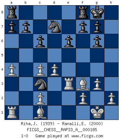 Last move : 1-0 2015 October 30 18:59:45 [Event "FICGS__CHESS__RAPID_A__000185"] [Site "FICGS"] [Date "2015.10.22"] [Round "1"] [White "Riha,Josef"] [Black "Ranalli,Emmanuel Eduardo"] [Result "1-0"] [WhiteElo "1939"] [BlackElo "2000"] 1.e4 d5 2.exd5 Qxd5 3.Nc3 Qd8 4.d4 c6 5.Nf3 Nf6 6.Be2 Bf5 7.Nh4 Bg6 8.O-O e6 9.g3 Be7 10.Re1 Nbd7 11.Bf3 O-O 12.Nxg6 hxg6 13.a4 Bb4 14.Re2 Bxc3 15.bxc3 Nd5 16.Qd3 Qa5 17.c4 Qc3 18.Qxc3 Nxc3 19.Re3 1-0 Scandinavian (centre counter) defense Kingside Castling by player White (move 8) Kingside Castling by player Black (move 11) Player White won this chess game. Follow this game move after move (download)I won't play with you anymore. You have insulted my friend. - When an opponent cursed himself for a blunder. (Miguel Najdorf) Es tut gut, die Entwicklungsperiode von, [...] demokratischem Geist durchdringen zu lassen. Wie undemokratisch wäre es doch beispielsweise, den einen Offizier große Spaziertouren vornehmen zu lassen, während die anderen zu Hause säßen und sich entsetzlich langweilten. (Aaron Nimzowitsch) Aún el Rey más flojo huye despavorido ante la amenaza de un Jaque doble. (Aaron Nimzowitsch) Il s'avisa de me proposer d'apprendre les échecs qu'il jouait un peu... me voilà forcené des échecs. J'achète un échiquier, je m'enferme dans ma chambre, j'y passe des jours et des nuits à vouloir apprendre par cur toutes les parties. (Jean-Jacques Rousseau, Confessions) A government big enough to give you everything you want is strong enough to take everything you have. (Thomas Jefferson)