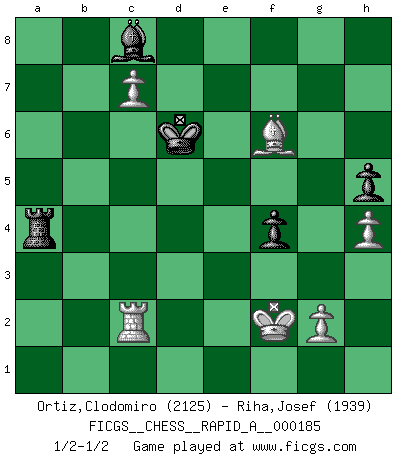 Last move : 1/2-1/2 2015 November 16 0:29:4 [Event "FICGS__CHESS__RAPID_A__000185"] [Site "FICGS"] [Date "2015.10.22"] [Round "1"] [White "Ortiz,Clodomiro"] [Black "Riha,Josef"] [Result "1/2-1/2"] [WhiteElo "2125"] [BlackElo "1939"] 1.d4 Nf6 2.c4 e6 3.Nc3 Bb4 4.e3 O-O 5.Bd3 d5 6.Nf3 c5 7.O-O dxc4 8.Bxc4 Nbd7 9.a3 Ba5 10.Qe2 a6 11.Bd3 b5 12.b4 cxd4 13.exd4 Bc7 14.a4 bxa4 15.Nxa4 Bb7 16.Nc5 Nxc5 17.dxc5 e5 18.Bc4 e4 19.Nd2 Be5 20.Ra3 Qb8 21.h3 Bc6 22.Rb3 Re8 23.Re1 Ra7 24.Bxa6 e3 25.fxe3 Ba4 26.Ra3 Qxb4 27.Qc4 Qxc4 28.Bxc4 Rea8 29.Nf3 Bg3 30.Rf1 Be8 31.Rxa7 Rxa7 32.Nd4 Rc7 33.Ba3 Ne4 34.c6 Nd2 35.Rc1 Nxc4 36.Rxc4 f6 37.Bc5 Kf7 38.Bb6 Rc8 39.Rc1 g6 40.Kf1 Be5 41.c7 Bd7 42.Kf2 h5 43.Rc2 Ke7 44.Ke2 Kd6 45.Ba5 Kd5 46.Nb3 Bd6 47.Kf3 Ra8 48.Bb6 f5 49.Na5 g5 50.Nb7 Ke6 51.Kf2 Bc8 52.Nxd6 Kxd6 53.Bd4 f4 54.exf4 gxf4 55.Bf6 Ra4 56.Bb2 Re4 57.h4 Ra4 58.Bg7 Ra7 59.Bf6 Ra4 60.Bd8 Rb4 61.Bf6 Ra4 1/2-1/2 Nimzo-Indian : 4.e3 O-O, 5.Bd3 d5 Kingside Castling by player Black (move 4) Kingside Castling by player White (move 7) This chess game ended in a draw. Follow this game move after move (download)Chess is played with the mind and not with the hands ! (Renaud and Kahn) Wer mein Gambit spielt, muß bereit sein, alle Brücken hinter sich abzubrechen. Es verändert den ganzen Menschen. Es wirkt wie ein Zauberstab und fördert verkümmerte, gute Charakter- eigenschaften wieder zu Tage. (Emil Joseph Diemer) Yo siempre he tenido un ligero sentimiento de lástima por una persona que no tiene conocimiento del Ajedrez. (Siegbert Tarrasch) Les échecs c'est le défi de l'alpiniste, toujours plus haut, prêt à tout pour monter à l'assaut du Roi ennemi. Les échecs, c'est de la musique en mouvement, un ballet majestueux pour les yeux. C'est de la poésie composée par les fantômes du passé qui au même titre que Rimbaud ou Verlaine méritent notre admiration. Les échecs, c'est de la peinture ou le moindre mouvement modifie le tableau pour en faire un Picasso ou un Van Gogh. Les échecs, c'est tout et rien, c'est la vie et la mort. Jjulie33 sur le forum de France-Echecs. Vladimir Ras-Putin is still alive... He is also a good actor, I saw him in the Lord of the Rings. (Rodolfo d'Ettorre)