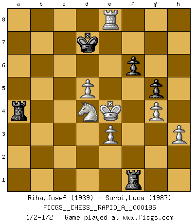 Last move : 1/2-1/2 2015 November 2 10:36:9 [Event "FICGS__CHESS__RAPID_A__000185"] [Site "FICGS"] [Date "2015.10.22"] [Round "1"] [White "Riha,Josef"] [Black "Sorbi,Luca"] [Result "1/2-1/2"] [WhiteElo "1939"] [BlackElo "1987"] 1.e4 e5 2.Nf3 Nf6 3.Nxe5 d6 4.Nf3 Nxe4 5.d4 d5 6.Bd3 Nc6 7.O-O Be7 8.c4 Nb4 9.Be2 O-O 10.Nc3 Bf5 11.a3 Nxc3 12.bxc3 Nc6 13.Re1 Re8 14.cxd5 Qxd5 15.Bf4 Rac8 16.h3 Be4 17.Qa4 Qf5 18.Bg3 Bc2 19.Qb5 Qxb5 20.Bxb5 a6 21.Re2 axb5 22.Rxc2 Na5 23.a4 bxa4 24.Rxa4 b6 25.Re2 Kf8 26.Rb2 Bf6 27.Bf4 h6 28.g4 Re6 29.d5 R6e8 30.Rc2 Be7 31.Be3 Nb3 32.Kg2 Bc5 33.Bf4 Red8 34.Rb2 Na5 35.Rd2 Nb7 36.Ne5 g5 37.Bh2 Bd6 38.Nc6 Re8 39.Ra7 Bxh2 40.Rxb7 Bf4 41.Rd4 Bd6 42.Rd3 Ra8 43.Rf3 Re1 44.Na7 Rb1 45.c4 Re8 46.Nb5 R8e1 47.Re3 Rg1+ 48.Kf3 Bf4 49.Nxc7 Bxe3 50.fxe3 Rgf1+ 51.Ke4 Rbc1 52.Nb5 Rxc4+ 53.Nd4 Ra4 54.Rxb6 Ke7 55.Rxh6 f6 56.Rh8 Kd7 57.Rb8 Kc7 58.Rg8 Kd6 59.Re8 Kd7 1/2-1/2 Petrov : Classical attack Kingside Castling by player White (move 7) Kingside Castling by player Black (move 9) This chess game ended in a draw. Follow this game move after move (download)It is peculiar but a fact nevertheless, that gamblers in chess always have enthusiastic followers. (Botvinnik) Garry Kasparov war erst in der Großmeister-Organisation GMA, dann in der Profischach-Vereinigung PCA, zum Schluss kehrte er wieder in den Schoß der FIDE zurück. Aber gut, manche Leute sind flexibel (Viswanathan Anand) El Rey es una pieza de pelea. ¡Usenlo!. (Wilhelm Steinitz) Les Echecs sont affaire de jugement sensible. Savoir quand frapper et quand esquiver. (Fischer) If only people were all showed a certain minimum level of niceness; if only people didn't retract verbal draw offers (without draw box ticked) on ficgs; if only people didn't kill; if only people didn't run concentration / extermination camps, if only people didn't drop nuclear bombs on Hiroshima and Nagasaki, and so on - it would be a much more beautiful world. But sadly, things are not so... (Normajean Yates)
