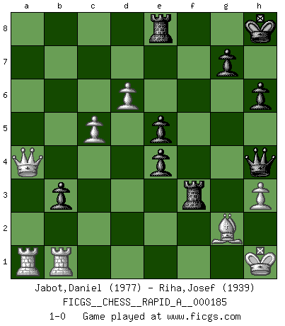 Last move : 1-0 2015 December 19 22:48:15 [Event "FICGS__CHESS__RAPID_A__000185"] [Site "FICGS"] [Date "2015.10.22"] [Round "1"] [White "Jabot,Daniel"] [Black "Riha,Josef"] [Result "1-0"] [WhiteElo "1977"] [BlackElo "1939"] 1.e4 e5 2.Nf3 Nc6 3.Bb5 a6 4.Ba4 Nf6 5.O-O Be7 6.Re1 b5 7.Bb3 d6 8.c3 O-O 9.h3 h6 10.d4 Re8 11.Nbd2 Bf8 12.Nf1 Bd7 13.Ng3 Na5 14.Bc2 c5 15.d5 Nc4 16.Nh2 Nb6 17.b3 c4 18.f4 a5 19.fxe5 dxe5 20.Rf1 Rc8 21.Qf3 cxb3 22.axb3 b4 23.c4 a4 24.Qe2 Bc5+ 25.Kh1 Bd4 26.Ra2 Nxc4 27.bxc4 b3 28.Ra3 Qb6 29.Bb1 Qb4 30.Rxf6 Qc3 31.Rf1 Qxg3 32.Nf3 Bb6 33.Ra1 Bc5 34.Bb2 Rc7 35.Bd3 Bb4 36.Rfb1 Bf8 37.Ba3 Bc5 38.Bxc5 Rxc5 39.Qb2 Rc7 40.Qc3 Bxh3 41.Bf1 f5 42.gxh3 fxe4 43.d6 Rf7 44.c5 Rxf3 45.Qc4+ Kh8 46.Bg2 Qh4 47.Qxa4 1-0 Ruy Lopez : Closed Kingside Castling by player White (move 5) Kingside Castling by player Black (move 8) Player White won this chess game. Follow this game move after move (download)All my games are real. (Bobby Fischer) Man braucht nicht immer den besten Zug zu spielen: Ein Zug muß aktiv, unternehmungslustig, korrekt und schön sein. (David Bronstein) Robert Fischer es la ley hacia si mismo. (Larry Evans) La tactique, c'est ce que vous faites quand il y a quelque chose à faire; la stratégie, c'est ce que vous faites quand il n'y a rien à faire. (Savielli Tartacower) At last I discovered the true beauty of chess. So I proposed to her. (Dinesh De Silva)