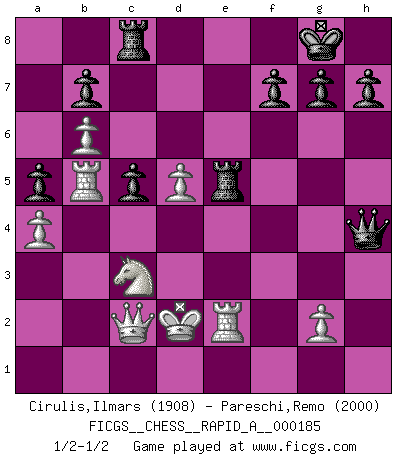 Last move : 1/2-1/2 2015 November 30 17:11:23 [Event "FICGS__CHESS__RAPID_A__000185"] [Site "FICGS"] [Date "2015.10.22"] [Round "1"] [White "Cirulis,Ilmars"] [Black "Pareschi,Remo"] [Result "1/2-1/2"] [WhiteElo "1908"] [BlackElo "2000"] 1.b4 e5 2.a3 a5 3.b5 d5 4.Bb2 Bd6 5.Nf3 Nd7 6.e3 Ngf6 7.d4 e4 8.Nfd2 Nb6 9.c4 dxc4 10.Nxc4 Nxc4 11.Bxc4 O-O 12.Nc3 c6 13.a4 Bd7 14.Ba3 Bxa3 15.Rxa3 Qe7 16.Qb3 Rac8 17.b6 c5 18.d5 Qe5 19.Qc2 Rfe8 20.Ra1 Qg5 21.Kf1 Re5 22.Rb1 Ng4 23.Be2 Nxe3 24.fxe3 Qxe3 25.Ke1 Qh6 26.Bb5 Bxb5 27.Rxb5 e3 28.Rf1 e2 29.Rf2 Qxh2 30.Rxe2 Qh4 31.Kd2 1/2-1/2 Polish (Sokolsky) opening Kingside Castling by player Black (move 11) This chess game ended in a draw. Follow this game move after move (download)Chess is a forcing house where the fruits of character can ripen more fully than in life. (Edward Morgan Foster) Über Kasparov: Es ist offensichtlich, daß er in einem totalitären Staat aufwuchs und deshalb zu diktatorischen Zügen neigt. (Viktor Kortschnoi) La enorme capacidad mental, en la que sin ella no puede un jugador de Ajedrez existir, es demasiado requerida por el Ajedrez al grado de que nunca podrá liberar su mente de este juego. (Albert Einstein) Le pion, dans sa simplicité, marche droit devant lui, mais lorsqu'il prend, il le fait obliquement? Ainsi l'homme, tant qu'il reste pauvre, marche dans la droiture et vit honnêtement, mais lorsqu'il recherche les honneurs, il flatte, se parjure et, par les voies obliques, cherche une position supérieure sur l'échiquier du monde. (Jean de Galles) I teach you to lie, cheat and steal, and as soon as my back's turned you wait in line ? (Gregory House, House M.D.)