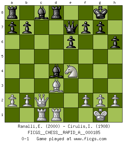 Last move : 0-1 2015 November 19 15:30:20 [Event "FICGS__CHESS__RAPID_A__000185"] [Site "FICGS"] [Date "2015.10.22"] [Round "1"] [White "Ranalli,Emmanuel Eduardo"] [Black "Cirulis,Ilmars"] [Result "0-1"] [WhiteElo "2000"] [BlackElo "1908"] 1.e4 c6 2.d4 d5 3.exd5 cxd5 4.c4 Nf6 5.Nc3 e6 6.Nf3 Bd6 7.Be2 dxc4 8.Bxc4 Nc6 9.O-O O-O 10.Bg5 h6 11.Bxf6 Qxf6 12.Ne4 Qe7 13.Rc1 Rd8 14.Bd3 Bc7 15.Qc2 Bb6 16.Rfd1 Nxd4 17.Nxd4 Bxd4 0-1 Caro-Kann : Panov-Botvinnik attack, 5...e6 Kingside Castling by player White (move 9) Kingside Castling by player Black (move 9) Player Black won this chess game. Follow this game move after move (download)In Chess, at least, the brave inherit the earth. (Edmar Mednis) Woher wissen wir, daß der Neanderthaler Blindschach gespielt hat? -- Bei Ausgrabungen wurden keine Schachbretter und Figuren gefunden. (Anonymous) Los Peones son nacidos libres, y aún así, se encuentran encadenados por todos lados. (Rick Kennedy) Le génie consiste à savoir transgresser les règles au moment opportun. (Teichmann) Lottery : A tax on people who are bad at math. (Author unknown)