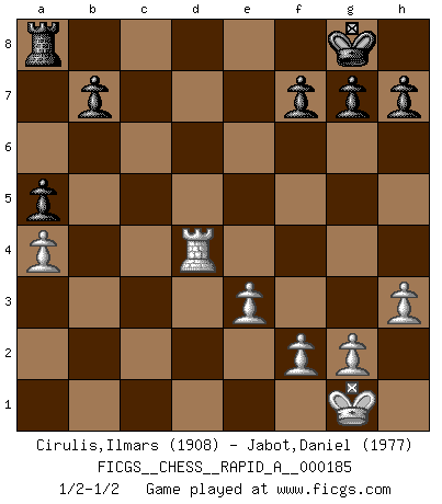 Last move : 1/2-1/2 2015 December 8 20:43:51 [Event "FICGS__CHESS__RAPID_A__000185"] [Site "FICGS"] [Date "2015.10.22"] [Round "1"] [White "Cirulis,Ilmars"] [Black "Jabot,Daniel"] [Result "1/2-1/2"] [WhiteElo "1908"] [BlackElo "1977"] 1.b4 e5 2.a3 d5 3.Bb2 Bd6 4.Nf3 Qe7 5.e3 Nf6 6.c4 c6 7.d4 exd4 8.Qxd4 dxc4 9.Bxc4 a5 10.b5 O-O 11.Nbd2 cxb5 12.Bxb5 Rd8 13.h3 Nc6 14.Qh4 Nd5 15.Qxe7 Bxe7 16.O-O Nc7 17.Be2 Bf5 18.Nb3 Ne6 19.a4 Bd3 20.Bxd3 Rxd3 21.Nbd4 Nexd4 22.Nxd4 Bf6 23.Rfd1 Rxd1+ 24.Rxd1 Nxd4 25.Bxd4 Bxd4 26.Rxd4 1/2-1/2 Polish (Sokolsky) opening Kingside Castling by player Black (move 10) Kingside Castling by player White (move 16) This chess game ended in a draw. Follow this game move after move (download)Becoming successful at Chess allows you to discover your own personality. That's what I want for the kids I teach. (Saudin Robovic) Matt entspricht nicht immer den Tatsachen. (Savielly Grigorievitsch Tartakower) No nos podemos resistir a la fascinación de un sacrificio ya que la pasión por los sacrificios es parte de la naturaleza de un jugador de Ajedrez. (Rudolf Spielman) Botvinnik disait en comparant les échecs à la musique: Il existe une science dont le but est l'étude de l'acoustique et des sons. Mais il y a aussi un art qui se sert de l'océan des sons : c'est la musique. De toute évidence, il en est de même pour la pensée. La logique est l'étude des lois de la réflexion et les échecs reflètent, en tant qu'art, le côté logique de la réflexion, sous la forme d'images artistiques... Extrait de Fischer - Spassky, Reykjavik 1972 par Alexander & F. Wyndham (Ed. Solar), p 37. Sometimes it pays to stay in bed in Monday, rather than spending the rest of the week debugging Monday's code. (Dan Salomon)