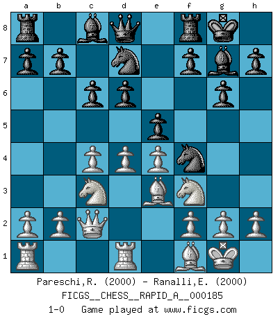 Last move : 1-0 2015 November 1 2:38:49 [Event "FICGS__CHESS__RAPID_A__000185"] [Site "FICGS"] [Date "2015.10.22"] [Round "1"] [White "Pareschi,Remo"] [Black "Ranalli,Emmanuel Eduardo"] [Result "1-0"] [WhiteElo "2000"] [BlackElo "2000"] 1.c4 Nf6 2.Nf3 d6 3.d4 g6 4.Nc3 Bg7 5.e4 Nbd7 6.Be2 O-O 7.O-O e5 8.Qc2 Nh5 9.Rd1 Nf4 10.Bf1 c6 11.Be3 1-0 English Opening Kingside Castling by player Black (move 6) Kingside Castling by player White (move 7) Player White won this chess game. Follow this game move after move (download)No Chess Grandmaster is normal; they only differ in the extent of their madness. (Viktor Korchnoi) Bis zum Jahr 1971 verlief in meiner Schachkariere alles glatt. Dieses dramatische Match [Fischer-Taimanov 6:0] machte mein Leben zur Hölle. (Mark Taimanov) Bobby Fischer es el jugador de Ajedrez mas grande que jamás haya existido. (Ken Smith) On croit qu'il y a plus de mauvais joueurs que de bons joueurs, c'est faux : Il y a autant de joueurs qui gagnent que de joueurs qui perdent. (Philippe Geluck) Opportunities multiply as they are seized. (Sun Tzu)