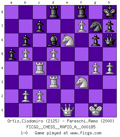 Last move : 1-0 2016 January 1 23:21:10 [Event "FICGS__CHESS__RAPID_A__000185"] [Site "FICGS"] [Date "2015.10.22"] [Round "1"] [White "Ortiz,Clodomiro"] [Black "Pareschi,Remo"] [Result "1-0"] [WhiteElo "2125"] [BlackElo "2000"] 1.e4 g6 2.d4 Bg7 3.Nf3 d6 4.Be2 Nf6 5.Nc3 O-O 6.O-O Nc6 7.d5 Nb8 8.Re1 e5 9.Be3 Nbd7 10.a4 Nc5 11.Nd2 a5 12.Bxc5 dxc5 13.Bb5 Qe7 14.Nc4 Rd8 15.Qf3 Ra7 16.Qe3 Ng4 17.Qe2 Nf6 18.Rad1 Nh5 19.g3 Qf6 20.Qf1 Bf8 21.Rd3 Bg4 22.f4 exf4 23.h3 Bc8 24.e5 Qg5 25.Ne4 Qh6 26.g4 Ng7 27.e6 Qh4 28.exf7+ Kh8 29.Ne5 Ra8 30.Nf3 Qh6 31.Neg5 Bd7 32.Re4 b6 33.Rxf4 Bxb5 34.axb5 Be7 35.h4 Rf8 36.Qe1 Bd6 37.Re4 c4 38.Rxc4 Rad8 39.Ne6 1-0 Robatsch (Modern) defense Kingside Castling by player Black (move 5) Kingside Castling by player White (move 6) Player White won this chess game. Follow this game move after move (download)All my games are real. (Bobby Fischer) Korrekt heißt in Deutschland die Haltung eines Mannes, dessen Benehmen nach dem Urteile seiner Nachbarn seiner Stellung angemessen ist. Um korrekt zu sein, muß man sich der Meinung der anderen anpassen... (Emanuel Lasker) Con o sin el título, Bobby Fischer fue sin lugar a dudas el mas grande jugador de su época. (Burt Hochberg) La menace est plus forte que l'exécution. (Aaron Nimzovitch) Computers make it easier to do a lot of things, but most of the things they make it easier to do don't need to be done. (Andy Rooney)