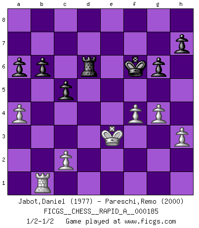 Last move : 1/2-1/2 2015 December 6 10:16:48 [Event "FICGS__CHESS__RAPID_A__000185"] [Site "FICGS"] [Date "2015.10.22"] [Round "1"] [White "Jabot,Daniel"] [Black "Pareschi,Remo"] [Result "1/2-1/2"] [WhiteElo "1977"] [BlackElo "2000"] 1.e4 g6 2.d4 Bg7 3.Nc3 d6 4.f4 Nf6 5.Nf3 O-O 6.Bd3 Na6 7.O-O c5 8.d5 Bg4 9.Bc4 Nc7 10.h3 Bxf3 11.Qxf3 a6 12.a4 b6 13.Qd3 e6 14.dxe6 fxe6 15.Rd1 d5 16.exd5 Nfxd5 17.Nxd5 exd5 18.Bxd5+ Qxd5 19.Qxd5+ Nxd5 20.Rxd5 Rad8 21.Rxd8 Rxd8 22.Be3 Bxb2 23.Rb1 Bd4 24.Kf2 Rd6 25.g4 Kf7 26.Kf3 Bxe3 27.Kxe3 Kf6 1/2-1/2 Robatsch defense : Pseudo-Austrian attack Kingside Castling by player Black (move 5) Kingside Castling by player White (move 7) This chess game ended in a draw. Follow this game move after move (download)Combinations have always been the most intriguing aspect of Chess. The masters look for them, the public applauds them, the critics praise them. It is because combinations are possible that Chess is more than a lifeless mathematical exercise. They are the poetry of the game; they are to Chess what melody is to music. They represent the triumph of mind over matter. (Reuben Fine) Sie führen leise Selbstgespräche, schlürfen lautstark ihre Getränke, schmatzen hörbar beim Essen, blasen ihrem Gegenüber Rauch in die Augen, niesen ihm ins Gesicht, starren ihn unverwandt an, bis er sich unter ihren Blicken windet, rutschen ständig auf ihrem Stuhl hin und her, rülpsen und bohren in der Nase. (Anonymous) La belleza de un movimiento no se refleja solo en su apariencia, sino en el pensamiento detrás de él. (Siegbert Tarrasch) Soyez une menace à chaque fois que vous vous asseyez pour jouer. (Ken Smith) As the days dwindle down... to a precious few. (Maxwell Anderson)