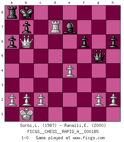 Last move : 1-0 2015 October 29 23:19:28 [Event "FICGS__CHESS__RAPID_A__000185"] [Site "FICGS"] [Date "2015.10.22"] [Round "1"] [White "Sorbi,Luca"] [Black "Ranalli,Emmanuel Eduardo"] [Result "1-0"] [WhiteElo "1987"] [BlackElo "2000"] 1.e4 c5 2.Nf3 d6 3.d4 cxd4 4.Nxd4 Nf6 5.Nc3 a6 6.Bg5 Nbd7 7.Bc4 Ne5 8.Bb3 h6 9.Bxf6 gxf6 10.f4 Ng6 11.Qh5 e6 12.Bxe6 Qb6 13.O-O-O Bxe6 14.Nxe6 Nxf4 15.Nxf4 Qe3+ 16.Kb1 Qxf4 17.Nd5 Qg5 18.Nc7+ Kd7 19.Qxf7+ Be7 20.Nxa8 Rxa8 21.Rxd6+ Kxd6 22.Rd1+ Kc6 23.Qe6+ Kc7 24.Rd7+ Kb8 25.Qb6 1-0 Sicilian : Najdorf, 6.Bg5 Queenside Castling by player White (move 13) Player White won this chess game. Follow this game move after move (download)We like to think. (Gary Kasparov) Wer nie einen Fehler gemacht hat, hat nie etwas Neues ausprobiert. (Albert Einstein) Aquel que ve no otra dirección en el juego que la de dar Jaque Mate a su oponente, nunca será un buen jugador de Ajedrez. (Euwe) Horreur, mais aussi harmonie suprême : qu'y avait-il en effet au monde en dehors des échecs ? Le brouillard, l'inconnu, le non-être... (Vladimir Nabokov) Fame, I have already. Now I need the money. (an elderly Steinitz)