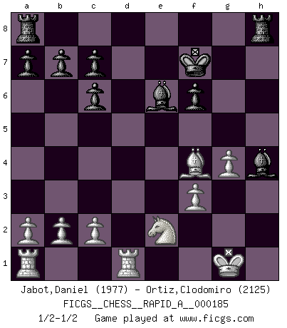 Last move : 1/2-1/2 2015 November 5 8:5:53 [Event "FICGS__CHESS__RAPID_A__000185"] [Site "FICGS"] [Date "2015.10.22"] [Round "1"] [White "Jabot,Daniel"] [Black "Ortiz,Clodomiro"] [Result "1/2-1/2"] [WhiteElo "1977"] [BlackElo "2125"] 1.e4 e5 2.Nf3 Nc6 3.Bb5 Nf6 4.O-O Nxe4 5.d4 Nd6 6.Bxc6 dxc6 7.dxe5 Nf5 8.Qxd8+ Kxd8 9.Nc3 Be7 10.Rd1+ Ke8 11.g4 Nh4 12.Nxh4 Bxh4 13.h3 h5 14.f3 f6 15.exf6 gxf6 16.Bf4 hxg4 17.hxg4 Be6 18.Ne2 Kf7 1/2-1/2 Ruy Lopez : Berlin defense, Open variation Kingside Castling by player White (move 4) This chess game ended in a draw. Follow this game move after move (download)Fischer prefers to enter Chess history alone. (Miguel Najdorf) Über Frauen: Chess is better. (Robert James Fischer) Un entendimiento minucioso de las típicas continuaciones de mate hacen de las mas complicadas combinaciones de sacrificio que conducen hacia ellas no solo no dificiles, sino casi un asunto de rutina. (Siegbert Tarrasch) Une platitude souvent récitée à propos des Echecs est qu'une des choses les plus difficiles à réaliser est de gagner une position gagnante. Cela ne manque pas de sens mais, pour ma part, j'ai toujours trouvé plus difficile de gagner une position perdante. (Tim Krabbe) Everything in life is luck. (Donald Trump)