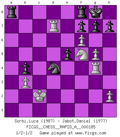 Last move : 1/2-1/2 2015 November 25 15:32:50 [Event "FICGS__CHESS__RAPID_A__000185"] [Site "FICGS"] [Date "2015.10.22"] [Round "1"] [White "Sorbi,Luca"] [Black "Jabot,Daniel"] [Result "1/2-1/2"] [WhiteElo "1987"] [BlackElo "1977"] 1.e4 c5 2.Nf3 d6 3.d4 cxd4 4.Nxd4 Nf6 5.Nc3 a6 6.Be3 e5 7.Nb3 Be6 8.f3 Be7 9.Qd2 O-O 10.O-O-O Nbd7 11.g4 b5 12.g5 b4 13.Ne2 Ne8 14.f4 a5 15.f5 Bxb3 16.cxb3 a4 17.bxa4 Rxa4 18.b3 Ra5 19.Kb1 Qa8 20.Ng3 d5 21.f6 Bc5 22.Qxd5 Rxa2 23.Qxa8 Rxa8 24.Bg1 Bxg1 25.Rxg1 Nc5 26.Bc4 Nc7 27.Nf5 Nxe4 28.Rd7 Nb5 29.Bxb5 Nc3+ 30.Kc2 Nxb5 31.Rg4 Nd4+ 1/2-1/2 Sicilian : Najdorf, Byrne (English) attack Kingside Castling by player Black (move 9) Queenside Castling by player White (move 10) This chess game ended in a draw. Follow this game move after move (download)The beauty of a move lies not in its' appearance but in the thought behind it. (Siegbert Tarrasch) Bobby Fischer ist kein Vorbild für die heutige Jugend. (Viktor Kortschnoi) El Ajedrez, como la música, como el amor, tiene el poder de hacer feliz a la gente. (Siegbert Tarrasch) La tactique est l'élément le plus important du milieu de jeu. (Siegbert Tarrasch) Faith : not wanting to know what is true. (Friedrich Nietzsche)