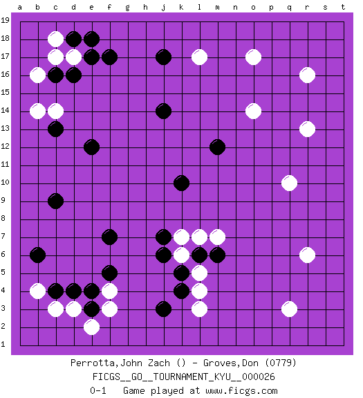 Last move : 0-1 2007 May 14 15:10:6 [Event "FICGS__GO__TOURNAMENT_KYU__000026"] [Site "FICGS"] [Date "2007.03.14"] [Round "1"] [Black "Perrotta,John Zach"] [White "Groves,Don"] [Result "0-1"] [Rating 2 "0779"] 1.d4 r16 2.d16 q3 3.j17 r6 4.c9 o17 5.j3 l3 6.e12 q10 7.f7 l17 8.j14 c14 9.c13 c17 10.c16 d17 11.f17 b16 12.e17 b14 13.d18 c18 14.e18 r13 15.k4 l4 16.k10 c3 17.c4 b4 18.b6 d3 19.e3 e2 20.m12 f3 21.e4 f4 22.f5 o14 23.l6 l5 24.k5 k6 25.j6 k7 26.j7 l7 27.m6 m7 0-1 This go game has been lost on time (started : 2007.03.14 5:49:3) Comment by player 1 : John Zach Perrotta : Hello! Im from Providence Rhode Island Here are the names of the openings (joseki) played in the four corners : Player White won this Go (weiqi, baduk) game. Follow this game move after move (download)While the Baroque rules of chess could only have been created by humans, the rules of go are so elegant, organic, and rigorously logical that if intelligent life forms exist elsewhere in the universe, they almost certainly play go. (Edward Lasker, international chess master) Wisdom begins at the end. (Daniel Webster)