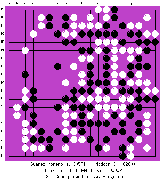 Last move : 1-0 2007 September 6 19:22:23 [Event "FICGS__GO__TOURNAMENT_KYU__000026"] [Site "FICGS"] [Date "2007.03.14"] [Round "1"] [Black "Suarez-Moreno,Alejandro"] [White "Maddin,John"] [Result "1-0"] [Rating 1 "0571"] [Rating 2 "0200"] 1.q16 d16 2.p4 d4 3.f3 c14 4.d3 c3 5.e4 d2 6.e3 e2 7.f2 c2 8.d5 c4 9.c7 c5 10.d6 b6 11.k16 l17 12.n17 r17 13.r16 q17 14.p17 s16 15.s15 t16 16.f17 e18 17.f18 e17 18.c11 c9 19.d9 c8 20.d8 b7 21.q12 r14 22.r15 p14 23.p15 o15 24.o16 n15 25.t15 s18 26.r13 q14 27.s14 o12 28.r5 r3 29.q3 q2 30.p2 q1 31.p1 s2 32.r4 s4 33.m16 m15 34.l16 j18 35.g16 j16 36.j15 h16 37.h15 k17 38.h17 j17 39.m18 m17 40.n16 l18 41.h18 n18 42.o18 n19 43.o19 m19 44.n13 o13 45.n12 o11 46.p10 r11 47.q11 r10 48.r8 s9 49.s8 q8 50.q7 p8 51.q9 o9 52.n10 o10 53.n9 n8 54.m8 n7 55.o6 n6 56.n5 m7 57.l5 m4 58.m5 n4 59.o4 l4 60.k5 j4 61.k4 k3 62.h3 j3 63.j5 h4 64.g4 h2 65.m2 n2 66.n3 m3 67.l3 h5 68.l9 l8 69.k9 k8 70.j9 l13 71.g12 j12 72.k14 k13 73.l12 h10 74.h8 j6 75.l7 l6 76.k7 m9 77.m10 m8 78.j7 h7 79.g7 h6 80.j8 p7 81.q6 p6 82.p5 o7 83.r9 t9 84.t8 s10 85.s12 q10 86.p9 p11 87.n14 o14 88.l14 m14 89.n11 k11 90.l11 k10 91.l10 q13 92.r12 s6 93.r7 s5 94.k6 1-0 This go game has been lost on time (started : 2007.03.14 5:49:3) Here are the names of the openings (joseki) played in the four corners : Corner d4 : d4 f3 Hoshi (Hwajeom, Seongjeom, Xingwei`) 4-4 Point. The star or hoshi (4-4) point, emphasizing influence at the potential expense of territory. Ikken Kakari (Hankan Keolch'im, Yi Gua`jiao~, 1-Space Low Approach). Black 2 is the standard approach move to the 4-4. Corner q16 : q16 l17 Hoshi (Hwajeom, Seongjeom, Xingwei`) 4-4 Point. The star or hoshi (4-4) point, emphasizing influence at the potential expense of territory. Player Black won this Go (weiqi, baduk) game. Follow this game move after move (download)Avoid the plate connection. (Anonymous) Perception is reality. (Immanuel Kant)