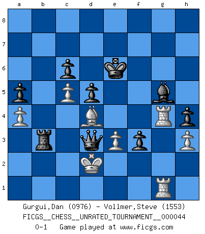Last move : 0-1 2016 May 28 9:14:59 [Event "FICGS__CHESS__UNRATED_TOURNAMENT__000044"] [Site "FICGS"] [Date "2015.10.24"] [Round "1"] [White "Gurgui,Dan"] [Black "Vollmer,Steve"] [Result "0-1"] [WhiteElo "0976"] [BlackElo "1553"] 1.d4 f5 2.Nd2 e6 3.b3 Nf6 4.Bb2 Be7 5.c4 d5 6.c5 Nc6 7.a3 O-O 8.b4 e5 9.dxe5 Ng4 10.f4 Be6 11.Nb3 Ne3 12.Qd3 Nxf1 13.Kxf1 g5 14.Nd4 Nxd4 15.Bxd4 gxf4 16.Nf3 a5 17.b5 Qe8 18.a4 Qh5 19.Kf2 Qg4 20.Rhg1 Kf7 21.h3 Qg3+ 22.Kf1 Qg6 23.Ke1 h5 24.Kd2 h4 25.Bf2 Qh5 26.Nd4 Rg8 27.Nxe6 Kxe6 28.Rad1 Rad8 29.Kc2 c6 30.bxc6 bxc6 31.Qa6 Rc8 32.g4 fxg4 33.Rxg4 Qf5+ 34.Rd3 Qxe5 35.Qxc8+ Rxc8 36.Kd2 Rb8 37.Bd4 Qf5 38.Rf3 Bg5 39.Rf1 f3 40.e3 Rb3 41.Rfg1 Qd3+ 0-1 Dutch Kingside Castling by player Black (move 7) Player Black won this chess game. Follow this game move after move (download)A win by an unsound combination, however showy, fills me with artistic horror. (Wilhelm Steinitz) Es macht mich traurig, wenn ich sehe, dass Golfprofis mehr verdienen als Schachsportler. Obwohl ich davon überzeugt bin, dass wir Schachspieler viel härter trainieren müssen als die Golfer. (Alexandra Kosteniuk) El sobresalir en el Ajedrez es un signo de una mente intrigante. (Sir Arthur Conan Doyle) Il vaut mieux sacrifier les pièces de l'adversaire. (Xavier Tartacover) It's not the size of the dog in the fight, it's the size of the fight in the dog. (Mark Twain)