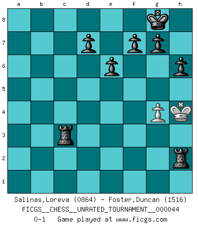 Last move : 0-1 2016 July 21 14:21:20 [Event "FICGS__CHESS__UNRATED_TOURNAMENT__000044"] [Site "FICGS"] [Date "2015.10.24"] [Round "1"] [White "Salinas,Loreva"] [Black "Foster,Duncan"] [Result "0-1"] [WhiteElo "0864"] [BlackElo "1516"] 1.Nc3 b6 2.e4 Bb7 3.Qf3 e6 4.e5 Ne7 5.Qxb7 Nbc6 6.Nb5 Nd5 7.c4 Rb8 8.Qa6 Ndb4 9.Qa4 a6 10.Na7 Nxa7 11.c5 Qh4 12.Nf3 Nd3+ 13.Ke2 Nxc1+ 14.Rxc1 Qxa4 15.cxb6 Rxb6 16.Rxc7 Qe4+ 17.Kd1 Rb7 18.d3 Qd5 19.b3 Rxc7 20.d4 Qe4 21.Nd2 Qxd4 22.Bc4 Qa1+ 23.Ke2 Qxe5+ 24.Kf3 Bb4 25.Rd1 O-O 26.g3 Qc3+ 27.Kg2 Qxd2 28.Rxd2 Bxd2 29.Bxa6 Nc6 30.a3 Ra8 31.Bc4 Rxa3 32.Kh3 Ne5 33.f4 Nxc4 34.bxc4 Bxf4 35.c5 Bxg3 36.hxg3 Rxc5 37.Kh4 Ra2 38.g4 h6 39.Kh3 Rc3+ 40.Kh4 Rh2+ 0-1 This chess game has been lost on time (started : 2015.10.24 16:3:1) Dunst (Sleipner, Heinrichsen) Opening Kingside Castling by player Black (move 25) 10 pieces endgame at move 36 : White KP , Black KRRPPPPP WHITE : King + 1 Pawn BLACK : King + 2 Rooks 5 Pawns Player Black won this chess game. Follow this game move after move (download)You know you're going to lose. Even when I was ahead I knew I was going to lose. - On playing against Fischer. (Andrew Soltis) Ich organisiere ein großes Turnier, was mich etwa 120000 Dollar kostet. Ich denke, das ist das erste Mal in der Schachgeschichte, daß ein Schachgroßmeister auch als Mäzen auftritt. (Miguel Najdorf) ¡Examina movidas que hagan daño! Un buen ojo for movidas desvastantes es mucho mas importante que el conocimiento de principios estratégicos. (Purdy) Echiquier : carré parfait, comme la Jérusalem nouvelle décrite par l'auteur de l'Apocalypse, huit cases sur huit, exaltation du chiffre 4, symbole du cosmos aux quatre horizons... où le noir et le blanc, l'ombre et la lumière, le mal et le bien s'entremêlent et se conjuguent. (Robert Couffignal, Le Gambit du poète) Panic is a sudden desertion of us, an a going over to the enemy of our imagination. (Christian Nevell Bovee)