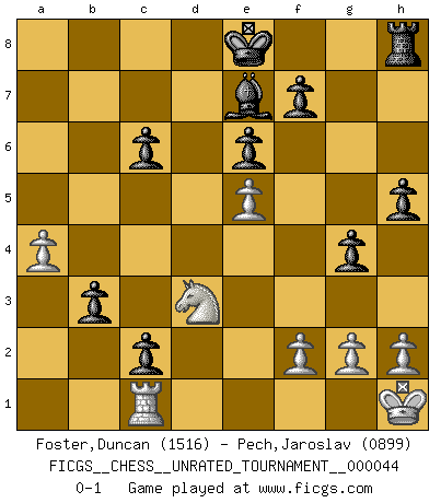 Last move : 0-1 2016 April 13 8:37:50 [Event "FICGS__CHESS__UNRATED_TOURNAMENT__000044"] [Site "FICGS"] [Date "2015.10.24"] [Round "1"] [White "Foster,Duncan"] [Black "Pech,Jaroslav"] [Result "0-1"] [WhiteElo "1516"] [BlackElo "0899"] 1.e4 e6 2.d4 d5 3.e5 c5 4.c3 Nc6 5.Nf3 Bd7 6.a3 Nge7 7.b4 cxd4 8.cxd4 Nf5 9.Bb2 Qb6 10.Be2 Be7 11.O-O h5 12.Qd3 a6 13.Nbd2 Nd8 14.Qb1 g5 15.Nb3 Bb5 16.Bxb5+ Qxb5 17.Qe1 a5 18.a4 Qxb4 19.Qxb4 axb4 20.Bc1 g4 21.Ne1 Rc8 22.Bd2 Rc4 23.Rc1 Nxd4 24.Rxc4 Ne2+ 25.Kh1 dxc4 26.Na5 c3 27.Be3 Nc6 28.Nxc6 bxc6 29.Nd3 b3 30.Bc1 Nxc1 31.Rxc1 c2 0-1 French : Advance, Euwe variation Kingside Castling by player White (move 11) Player Black won this chess game. Follow this game move after move (download)Chess is played with the mind and not with the hands ! (Renaud and Kahn) Das Schachspiel ist ein See, in welchem eine Mücke baden und ein Elefant ertrinken kann. (Emanuel Lasker) No hay otro maestro que tenga una voluntad terrífica de ganar. Al tablero, el irradía peligro y aún los oponentes mas fuertes tienden a congelarse como liebres cuando olfatean a una pantera. Aún sus debilidades son peligrosas. Con las blancas, su juego de apertura es predecible - te es posible hacer planes en su contra - pero es tan fuerte que tus planes casi nunca funcionan. En el juego medio, su precisión e invención son fabulosas y en finales, tú simplemente no le puedes vencer. (Experto Alemán anónimo) Les écrivains ont utilisé les échecs pour analyser les côtés extrêmes de la nature humaine. Dans ce cadre, les échecs offrent un champ d'expérimentation idéal. Mais on pourrait faire la même chose avec la peinture. Et là, en vous référant à Van Gogh, vous ne tirerez pas de conclusion définitive sur les peintres. (Gary Kasparov) You cannot beat a roulette table unless you steal money from it. (Albert Einstein)