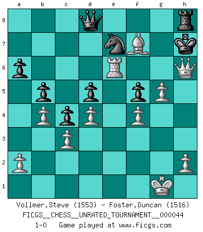 Last move : 1-0 2015 November 1 20:42:24 [Event "FICGS__CHESS__UNRATED_TOURNAMENT__000044"] [Site "FICGS"] [Date "2015.10.24"] [Round "1"] [White "Vollmer,Steve"] [Black "Foster,Duncan"] [Result "1-0"] [WhiteElo "1553"] [BlackElo "1516"] 1.Nf3 b6 2.e4 Bb7 3.d4 Bxe4 4.Bc4 h6 5.O-O d5 6.Qe2 Bxf3 7.Qxf3 c6 8.Bd3 g6 9.Nc3 e6 10.Bf4 Bg7 11.Ne2 Ne7 12.Rfe1 O-O 13.Rad1 Re8 14.Bxb8 Rxb8 15.c3 c5 16.Bb5 Rf8 17.b4 c4 18.Qh3 Kh7 19.f4 Ng8 20.g4 f5 21.g5 h5 22.Ng3 Ne7 23.Rxe6 a6 24.Ba4 b5 25.Bc2 Rb6 26.Rde1 Rxe6 27.Rxe6 Qe8 28.Bd1 Rh8 29.Nxh5 gxh5 30.Bxh5 Qd8 31.Bf7 Bh6 32.Qxh6+ 1-0 Reti Opening Kingside Castling by player White (move 5) Kingside Castling by player Black (move 12) Player White won this chess game. Follow this game move after move (download)Blessed be the memory of him who gave the world this immortal game. (A. G. Gardiner) Die FIDE ist dabei in die Hände der russischen Mafia zu fallen. (Larry Evans) Los tropiezos estan todos ahí en el tablero, esperando que se cometan. (Savielly Tartakover) Nous vivons dans un monde échiquéen : chaque jour qui passe est un défi à relever. (Philosophe Sasha) We're missing something. (Gregory House, House M.D.)