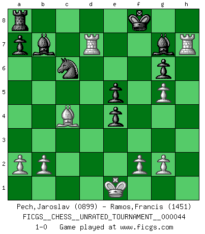 Last move : 1-0 2016 February 27 14:50:9 [Event "FICGS__CHESS__UNRATED_TOURNAMENT__000044"] [Site "FICGS"] [Date "2015.10.24"] [Round "1"] [White "Pech,Jaroslav"] [Black "Ramos,Francis"] [Result "1-0"] [WhiteElo "0899"] [BlackElo "1451"] 1.d4 Nf6 2.c4 g6 3.Nc3 Bg7 4.e4 d6 5.Nf3 O-O 6.Be2 e5 7.dxe5 dxe5 8.Qxd8 Rxd8 9.Bg5 Re8 10.Nd5 Nxd5 11.cxd5 h6 12.Be3 f5 13.Rc1 c6 14.Bc4 Kh7 15.h4 fxe4 16.Ng5+ hxg5 17.hxg5 Kg8 18.dxc6 Kf8 19.Bc5+ Re7 20.cxb7 Bxb7 21.Bxe7+ Kxe7 22.Rd1 Nc6 23.Rh7 Kf8 24.Rd7 1-0 King's Indian : Andersson variation Kingside Castling by player Black (move 5) Player White won this chess game. Follow this game move after move (download)Good offense and good defense both begin with good development. (Bruce A. Moon) Im Fernschach kannst du während dem Spiel rauchen. (John Christen Knudsen) La partida mas dura de ganar es una partida ganada. (Emanuel Lasker) Avant la finale, les dieux ont créé le milieu de partie. (Tarrasch) No, no, you're not thinking; you're just being logical. (Niels Bohr)