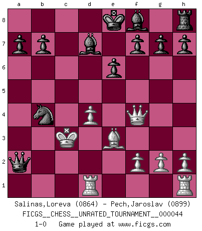Last move : 1-0 2016 August 30 9:16:10 [Event "FICGS__CHESS__UNRATED_TOURNAMENT__000044"] [Site "FICGS"] [Date "2015.10.24"] [Round "1"] [White "Salinas,Loreva"] [Black "Pech,Jaroslav"] [Result "1-0"] [WhiteElo "0864"] [BlackElo "0899"] 1.Nf3 d5 2.d4 Nf6 3.e3 e6 4.Ng5 c5 5.c4 cxd4 6.Qa4+ Bd7 7.Qb3 dxc4 8.Qxc4 Qa5+ 9.Bd2 Qxg5 10.Qc7 Nc6 11.exd4 Qf5 12.Bb5 Qxb5 13.Nc3 Qa6 14.Be3 Rc8 15.Qf4 Nb4 16.O-O-O Nfd5 17.Qe4 Rxc3+ 18.bxc3 Nxc3 19.Qf4 Qa3+ 20.Kd2 Qxa2+ 21.Kxc3 1-0 This chess game has been lost on time (started : 2015.10.24 16:3:1) Reti Opening Queenside Castling by player White (move 16) Player White won this chess game. Follow this game move after move (download)Chess problems demand from the composer the same virtues that characterize all worthwhile art: originality, invention, conciseness, harmony, complexity, and splendid insincerity. (Vladimir Nabokov) Der Partner hat auch seine Existenzberechtigung. (Savielly Grigorievitsch Tartakower) Las Aperturas te enseñan aperturas. ¡Los Finales te enseñan Ajedrez!. (Stephan Gerzadowicz) Ne tendez aucun piège pour le plaisir ! Ne jouez rien dans l'espoir que l'adversaire réagisse de façon stupide ! Prenez toujours pour acquis que l'adversaire va trouver le meilleur coup ! Ne jouez jamais de coup dans l'espoir que l'adversaire ne voie pas la menace ! Chacun de vos coups doit améliorer la position d'une façon ou d'une autre. Sometimes it pays to stay in bed in Monday, rather than spending the rest of the week debugging Monday's code. (Dan Salomon)
