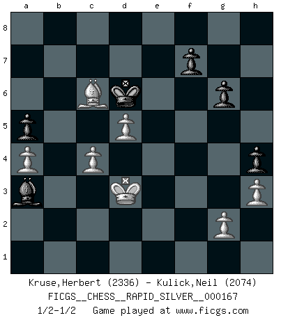 Last move : 1/2-1/2 2016 March 1 22:38:36 [Event "FICGS__CHESS__RAPID_SILVER__000167"] [Site "FICGS"] [Date "2015.10.24"] [Round "1"] [White "Kruse,Herbert"] [Black "Kulick,Neil"] [Result "1/2-1/2"] [WhiteElo "2336"] [BlackElo "2074"] 1.e4 c5 2.Nf3 d6 3.d4 cxd4 4.Nxd4 Nf6 5.Nc3 a6 6.f3 e5 7.Nb3 Be6 8.Be3 h5 9.Be2 Nbd7 10.Nd5 Bxd5 11.exd5 g6 12.Qd2 Bg7 13.Na5 Rb8 14.Nc4 O-O 15.Nxd6 Nb6 16.Ne4 Nbxd5 17.O-O-O Nxe3 18.Qxe3 Qe7 19.Qc5 Qe6 20.Kb1 Rbc8 21.Qd6 Nxe4 22.fxe4 Qxd6 23.Rxd6 Rc7 24.Rhd1 Rfc8 25.c3 Bf8 26.Rd7 a5 27.Kc2 b6 28.Bb5 Bh6 29.R7d6 Be3 30.R6d3 Bg5 31.Rd6 Be3 32.Kd3 Bc5 33.Rd5 Be7 34.Ke2 Rc5 35.a4 Rxd5 36.Rxd5 Kf8 37.h3 Rd8 38.Rxe5 Bf6 39.Rd5 Rxd5 40.exd5 Ke7 41.Kd3 Bg5 42.Bc6 Kd6 43.b3 Bc1 44.Be8 Ke7 45.Bb5 h4 46.Kc4 Be3 47.Bc6 Kd6 48.Kb5 Bd2 49.Kc4 Be3 50.b4 Bd2 51.Be8 Ke7 52.Bb5 Kd6 53.Be8 Ke7 54.Bb5 Kd6 55.bxa5 bxa5 56.Be8 Ke7 57.Bc6 Kd6 58.Bb7 Be1 59.Ba8 Bd2 60.Bb7 Be1 61.Bc8 Bf2 62.Ba6 Be3 63.Kd3 Bg1 64.Bb7 Bf2 65.Bc6 Bg3 66.Ba8 Be1 67.Kd4 Bf2+ 68.Ke4 Bg3 69.Bb7 Be5 70.Kd3 Kc5 71.Bc6 Kd6 72.c4 Bb2 73.Be8 Ke7 74.Bb5 Kd6 75.Bc6 Ba3 1/2-1/2 Comment by player 1 : Herbert Kruse : i protest against this draw Comment by player 2 : Neil Kulick : Now somehow Kd6 has been played for me -- I didn't play it. It WAS the move I would have played. If I'd played it, I would have claimed a draw by 3-fold repetition. I am entitled to the draw. Herbert Kruse https://en.wikipedia.org/wiki/ Herbert Kruse with the same player to move. Herbert Kruse i protest against this draw Sicilian : Najdorf Kingside Castling by player Black (move 14) Queenside Castling by player White (move 17) This chess game ended in a draw. Follow this game move after move (download)Chess, like love, is infectious at any age. (Flohr) Ivan Sokolov treibt mich als Beifahrer an mit go Loeky go - . (Loek van Wely) Jugadores de primera clase pierden en contra de jugadores de segunda clase porque los jugadores de segunda clase a veces juegan una partida de primer clase. (Siegbert Tarrasch) Vouloir jouer aux échecs contre soi-même est aussi paradoxal que vouloir marcher sur son ombre. (Stefan Zweig) To steal ideas from one person is plagiarism. To steal from many is research. (Unknown)