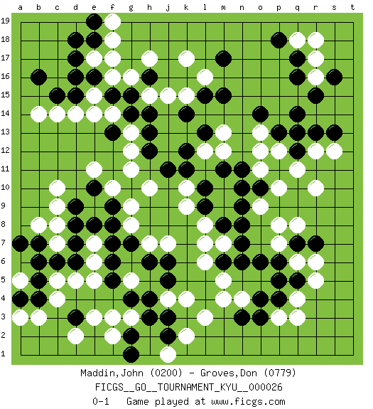 Last move : 0-1 2007 September 6 13:20:1 [Event "FICGS__GO__TOURNAMENT_KYU__000026"] [Site "FICGS"] [Date "2007.03.14"] [Round "1"] [Black "Maddin,John"] [White "Groves,Don"] [Result "0-1"] [Rating 1 "0200"] [Rating 2 "0779"] 1.q16 c4 2.d16 q3 3.n3 r5 4.r13 c14 5.b16 c10 6.c6 e3 7.b4 b3 8.b5 k17 9.m17 f17 10.e18 e17 11.d17 f18 12.e19 e15 13.e16 f16 14.d15 d14 15.c15 f14 16.g15 h15 17.h16 f19 18.d18 h17 19.h14 j15 20.f15 e14 21.g14 g16 22.f13 g13 23.h13 g12 24.h12 g11 25.k14 k15 26.l15 l16 27.m15 l3 28.j3 m4 29.p4 p3 30.o3 n4 31.o4 k4 32.g4 g3 33.g2 f2 34.h3 f3 35.g1 r10 36.r7 q8 37.q7 p7 38.p6 q6 39.q5 r6 40.o6 q4 41.p5 p8 42.n8 l6 43.m6 m7 44.n7 l7 45.m8 m5 46.n6 e5 47.f6 j7 48.h6 h7 49.j6 j4 50.h4 k2 51.j2 j1 52.j5 e6 53.f7 l8 54.l9 k9 55.l10 k10 56.k11 h10 57.j11 r17 58.q17 r16 59.r15 q18 60.p18 r18 61.s16 s12 62.s13 c8 63.d9 c9 64.d7 e7 65.g7 g8 66.f5 g5 67.f8 g9 68.f9 f10 69.e10 e11 70.d8 c7 71.d6 c5 72.b7 b8 73.a7 a5 74.a4 a3 75.b6 r12 76.q12 q13 77.p13 p12 78.q14 o12 79.n11 p10 80.o10 o9 81.n9 o11 82.n10 q11 83.q13 o13 84.o14 m13 85.l13 m12 86.m11 l12 87.k12 b14 88.d3 d2 89.e8 d5 0-1 This go game has been lost on time (started : 2007.03.14 5:49:3) Here are the names of the openings (joseki) played in the four corners : Corner q4 : q3 n3 Komoku (Somok, Xiao~mu`) 3-4 Point. The komoku (3-4) point is the traditional corner enclosure move.. Corner d16 : d16 c14 Hoshi (Hwajeom, Seongjeom, Xingwei`) 4-4 Point. The star or hoshi (4-4) point, emphasizing influence at the potential expense of territory. Ikken Kakari (Hankan Keolch'im, Yi Gua`jiao~, 1-Space Low Approach). White 2 is the standard approach move to the 4-4. Corner d4 : c4 c6 Komoku (Somok, Xiao~mu`) 3-4 Point. The komoku (3-4) point is the traditional corner enclosure move.. Player White won this Go (weiqi, baduk) game. Follow this game move after move (download)Go is essentially a form of harmony. Go in the 21st century will have to be go of the 'harmony of the six points - the four quarters, the above and the below.' As in life we will need to view the whole rather than the part. Japanese go has focused too heavily on the local (joseki) rather than the whole for 300 years. The reason the Chinese and Koreans are overtaking the Japanese is that they are closer to achieve this whole-board view. (Go Seigen, 9p, 1994) I just play for fun. (Anna Kournikova)