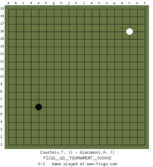 Last move : 0-1 2006 July 1 0:24:10 [Event "FICGS__GO__TOURNAMENT__000002"] [Site "FICGS"] [Date "2006.05.30"] [Round "1"] [Black "Cousteix,Thierry"] [White "Giacomoni,Aldric"] [Result "0-1"] 1.e6 r16 0-1 This go game has been lost on time (started : 2006.05.30 17:30:51) Here are the names of the openings (joseki) played in the four corners : Player White won this Go (weiqi, baduk) game. Follow this game move after move (download)Grab the border points between two moyos. (Anonymous) Hold em is to stud what chess is to checkers. (Johnny Moss)