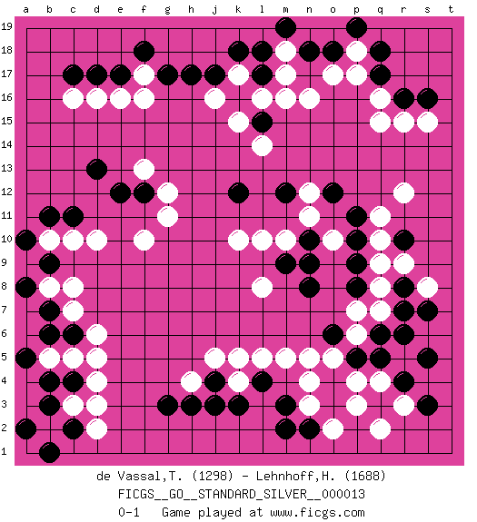 Last move : 0-1 2016 April 16 16:33:53 [Event "FICGS__GO__STANDARD_SILVER__000013"] [Site "FICGS"] [Date "2015.10.30"] [Round "2"] [Black "de Vassal,Thibault"] [White "Lehnhoff,Heinz-Georg"] [Result "0-1"] [Rating 1 "1298"] [Rating 2 "1688"] 1.q3 d16 2.q17 d4 3.r10 q15 4.r16 n16 5.h17 r15 6.n18 r12 7.r7 k4 8.m3 m5 9.o4 o5 10.p5 n4 11.o3 o17 12.o18 p17 13.q18 n3 14.n2 d10 15.c17 c16 16.d17 p18 17.p19 e16 18.e17 f17 19.f18 f16 20.g17 m17 21.l18 m18 22.m19 q16 23.s16 s15 24.l17 l16 25.k16 k15 26.l15 m16 27.d13 k17 28.k18 j16 29.j17 f13 30.e12 f10 31.f12 g12 32.c11 c10 33.b11 g11 34.m12 m10 35.o12 o10 36.p11 q10 37.p10 q9 38.p9 q11 39.b9 b10 40.a10 c8 41.b7 b8 42.a8 c7 43.b6 c5 44.b4 b5 45.a5 c3 46.b3 b2 47.c6 d6 48.c4 d5 49.c2 d3 50.a2 d2 51.b1 q8 52.p8 q7 53.n8 l8 54.k12 k10 55.o6 n5 56.l4 l5 57.k3 p6 58.q6 p7 59.r6 p4 60.q5 o2 61.m2 p3 62.j4 k5 63.g3 h4 64.h3 j5 65.j3 q4 66.r4 s8 67.r8 r9 68.s7 r3 69.s3 q2 70.s5 l14 71.m9 l10 72.n10 n11 73.n9 n12 0-1 Here are the names of the openings (joseki) played in the four corners : Corner q16 : q17 q15 Komoku (Somok, Xiao~mu`) 3-4 Point. The komoku (3-4) point is the traditional corner enclosure move.. Ikken Takagakari (Hankan Nop'dakeolch'im, Yi Gaogua`jiao~, 1-Space High Approach). The 5-4 approach move has become more popular in modern times, as modern Go emphasizes speed and influence. Corner d16 : d16 h17 Hoshi (Hwajeom, Seongjeom, Xingwei`) 4-4 Point. The star or hoshi (4-4) point, emphasizing influence at the potential expense of territory. Corner d4 : d4 b9 Hoshi (Hwajeom, Seongjeom, Xingwei`) 4-4 Point. The star or hoshi (4-4) point, emphasizing influence at the potential expense of territory. Player White won this Go (weiqi, baduk) game. Follow this game move after move (download)Do not fear furikawari. (Anonymous) Hold em is to stud what chess is to checkers. (Johnny Moss)