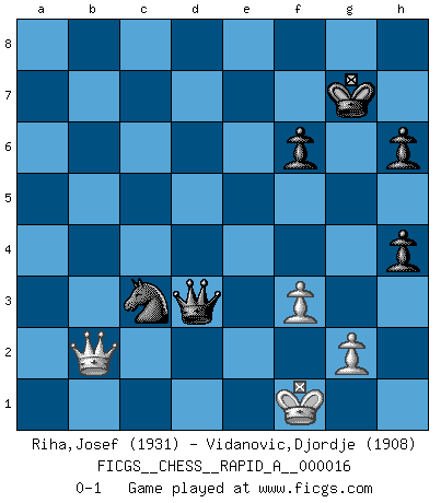 Last move : 0-1 2007 May 2 15:15:33 [Event "FICGS__CHESS__RAPID_A__000016"] [Site "FICGS"] [Date "2007.03.15"] [Round "1"] [White "Riha,Josef"] [Black "Vidanovic,Djordje"] [Result "0-1"] [WhiteElo "1931"] [BlackElo "1908"] 1.d4 Nf6 2.c4 g6 3.Nc3 d5 4.cxd5 Nxd5 5.e4 Nxc3 6.bxc3 Bg7 7.Nf3 c5 8.Rb1 O-O 9.Be2 b6 10.O-O Bb7 11.Qd3 e6 12.Bg5 Qc7 13.Qe3 Nd7 14.e5 Bd5 15.Be7 Rfc8 16.Bd6 cxd4 17.cxd4 Qb7 18.a4 Bc4 19.Rfe1 Bxe2 20.Rxe2 Qd5 21.Rc1 Rc4 22.Rec2 Rac8 23.Qe2 R4c6 24.Rxc6 Rxc6 25.Rc2 Bf8 26.Bc7 Be7 27.h3 Kg7 28.h4 a6 29.h5 gxh5 30.Qd2 h6 31.Qc1 Rxc2 32.Qxc2 b5 33.axb5 axb5 34.Qb2 b4 35.Nd2 h4 36.Bd6 Bxd6 37.exd6 Qxd6 38.d5 e5 39.Nc4 Qc5 40.Qe2 Nf6 41.d6 Qd4 42.Ne3 Kg6 43.Qe1 Qxd6 44.Nc4 Qd5 45.Nxe5+ Kg7 46.Qe2 b3 47.Nd3 Qd4 48.Qd1 Ng4 49.Qb1 f6 50.Kf1 b2 51.f3 Ne3+ 52.Kg1 Nd1 53.Kf1 Nc3 54.Qxb2 Qxd3+ 0-1 King's Indian defense, 3.Nc3 Kingside Castling by player Black (move 8) Kingside Castling by player White (move 10) 10 pieces endgame at move 54 : White KQPP , Black KQNPPP WHITE : King + 1 Queen 2 Pawns BLACK : King + 1 Queen 1 Knight 3 Pawns Player Black won this chess game. Follow this game move after move (download)You have to have the fighting spirit. You have to force moves and take chances. (Bobby Fischer) Die größte Kunst beim Schach besteht darin dem Gegner nicht zu zeigen was er tun kann. (Garry Kasparov) Cuando veas una buena jugada, trata de encontrar otra mejor. (Emanuel Lasker) Il vaut toujours mieux jouer un plan faux de façon logique que de n'avoir pas de plan du tout. (Victor Kortchnoï) There is a computer disease that anybody who works with computers knows about. It's a very serious disease and it interferes completely with the work. The trouble with computers is that you 'play' with them ! (Richard P. Feynman)