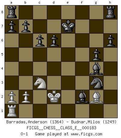 Last move : 0-1 2015 November 19 11:38:14 [Event "FICGS__CHESS__CLASS_E__000183"] [Site "FICGS"] [Date "2015.10.31"] [Round "1"] [White "Barradas,Anderson"] [Black "Budnar,Milos"] [Result "0-1"] [WhiteElo "1364"] [BlackElo "1249"] 1.e4 e5 2.Nf3 Nc6 3.d4 exd4 4.Nxd4 Bc5 5.c3 Nf6 6.Bg5 d6 7.h3 h6 8.Bh4 g5 9.Bg3 Nxe4 10.Qe2 Qe7 11.Bh2 Nxd4 12.cxd4 Bxd4 13.Bg3 Nxg3 14.Qxe7+ Kxe7 15.Nd2 Nxh1 16.Ne4 f5 17.Nc3 Bxf2+ 18.Kd2 c6 19.g4 Ng3 20.Bg2 fxg4 21.hxg4 Bxg4 0-1 Scotch game Player Black won this chess game. Follow this game move after move (download)I guess a certain amount of temperament is expected of Chess geniuses. (Ron Gross) Wie gewinnt Tal? Er entwickelt alle seine Figuren in die Brettmitte und opfert sie dann irgendwo. (Robert James Fischer) Un sacrificio se refuta mucho mejor al aceptarlo. (Wilhelm Steinitz) La vie est comme un jeu d'échecs : nous esquissons un plan, mais celui-ci est tributaire de ce que daignent faire l'adversaire aux échecs et le destin dans la vie. (Arthur Schopenhauer) The intuitive mind is a sacred gift; the rational mind is a faithful servant. We have created a society that honors the servant but has forgotten the gift. (Albert Einstein)