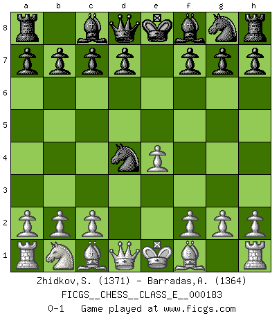 Last move : 0-1 2015 December 13 8:48:13 [Event "FICGS__CHESS__CLASS_E__000183"] [Site "FICGS"] [Date "2015.10.31"] [Round "1"] [White "Zhidkov,Sergey"] [Black "Barradas,Anderson"] [Result "0-1"] [WhiteElo "1371"] [BlackElo "1364"] 1.e4 e5 2.Nf3 Nc6 3.d4 exd4 4.Nxd4 Nxd4 0-1 This chess game has been lost on time (started : 2015.10.31 23:51:55) Scotch game Player Black won this chess game. Follow this game move after move (download)It is not a move, even the best move that you must seek, but a realizable plan. (Eugene Znosko-Borovsky) Dass jemand wie Surab Asmaiparaschwili, der selbst Elopunkte gekauft hat , Vize-Präsident der Fide werden konnte, sagt schon einges über den Zustand dieser Organisation aus. (Joel Lautier) Una buena memoria, concentración, imaginación y una fuerte voluntad, se requiere para llegar a ser un buen jugador. (Bobby Fischer) Roi des jeux et jeu des rois, les échecs portent en eux un sentiment d'infini. Ils donnent à celui qui s'est efforcé d'en approfondir les arcanes l'impression de n'être pas à la mesure de l'homme; en fait, ils constituent un résumé de l'univers, un microcosme, et figurent cette grande échelle qui, dans les plans de la lumière descend jusqu'à la matière, qui des abîmes insondables remonte jusqu'en l'infini de Dieu. (Pyrame) A good aphorism is too hard for the tooth of time, and is not worn away with the centuries, although it serves as food for every speech. (Friedrich Nietzsche)