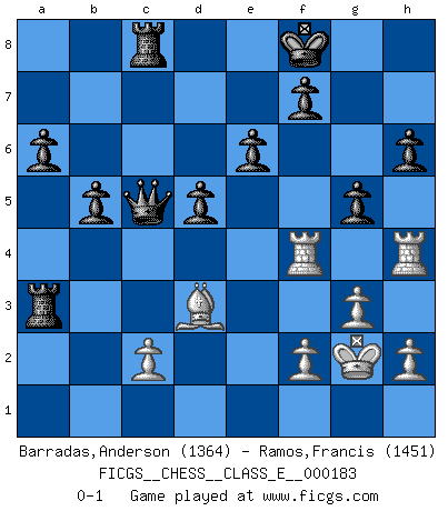 Last move : 0-1 2015 November 24 17:56:17 [Event "FICGS__CHESS__CLASS_E__000183"] [Site "FICGS"] [Date "2015.10.31"] [Round "1"] [White "Barradas,Anderson"] [Black "Ramos,Francis"] [Result "0-1"] [WhiteElo "1364"] [BlackElo "1451"] 1.e4 c5 2.Nf3 d6 3.d4 cxd4 4.Nxd4 Nf6 5.Nc3 a6 6.Be2 e6 7.Bg5 Be7 8.Nf3 O-O 9.O-O Nc6 10.a3 b5 11.b4 Bb7 12.Bd3 Rc8 13.Ne2 Ne5 14.Nf4 Nxe4 15.Bxe7 Qxe7 16.Re1 Nc3 17.Qd2 Bxf3 18.g3 Qb7 19.Kf1 Be2+ 20.Nxe2 Qh1+ 21.Ng1 Nf3 22.Qxc3 Rxc3 23.Ke2 Nxg1+ 24.Rxg1 Qd5 25.Rad1 Qe5+ 26.Kf1 Rxa3 27.Re1 Qc3 28.Kg2 Qxb4 29.Re4 Qc5 30.Rh4 h6 31.Re1 Rc8 32.R1e4 d5 33.Reg4 Kf8 34.Rf4 g5 0-1 Sicilian : Najdorf, Opovcensky variation Kingside Castling by player Black (move 8) Kingside Castling by player White (move 9) Player Black won this chess game. Follow this game move after move (download)When asked, -How is that you pick better moves than your opponents?, I responded: I'm very glad you asked me that, because, as it happens, there is a very simple answer. I think up my own moves, and I make my opponent think up his. (Alexander Alekhine) Modernes Schach sorgt sich zuviel um Dinge wie Bauernstruktur usw. Vergessen Sie das, Schachmatt beendet das Spiel! (Nigel Short) Prefiero perder una partida realmente buena, que ganar una mala. (David Levy) Le joueur d'Echecs qui veut atteindre le top est obligé de développer son propre credo créatif. Alexeï Stepanovicth Souétine. Il est facile d'écrire des livres ! Ce qui est difficile, c'est de jouer ! (Alexeï Stepanovicth Souétine) All men can see these tactics whereby I conquer, but what none can see is the strategy out of which victory is evolved. (Sun Tzu)