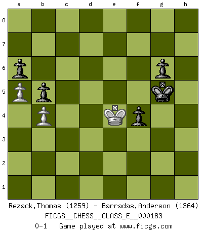Last move : 0-1 2016 February 5 13:5:52 [Event "FICGS__CHESS__CLASS_E__000183"] [Site "FICGS"] [Date "2015.10.31"] [Round "1"] [White "Rezack,Thomas"] [Black "Barradas,Anderson"] [Result "0-1"] [WhiteElo "1259"] [BlackElo "1364"] 1.e4 e5 2.Nf3 Nc6 3.Bb5 a6 4.Ba4 Nf6 5.O-O b5 6.Bb3 h6 7.Re1 Bb7 8.c3 Bc5 9.d3 d6 10.Nbd2 Ng4 11.Re2 O-O 12.h3 Nxf2 13.Rxf2 Bxf2+ 14.Kxf2 Ne7 15.d4 Ng6 16.Bc2 Re8 17.a4 c6 18.Nb3 exd4 19.Nbxd4 c5 20.Nf5 Re6 21.a5 Bxe4 22.Bxe4 Rxe4 23.Be3 Re6 24.Qd5 Rc8 25.Rd1 Ne7 26.Nxe7+ Qxe7 27.Re1 Qf6 28.Qd2 Rce8 29.b4 c4 30.Qd5 Qxc3 31.Bd2 Qf6 32.Rxe6 Rxe6 33.Be3 Qb2+ 34.Bd2 c3 35.Qd4 Rf6 36.Kg1 Rxf3 37.gxf3 Qb1+ 38.Kg2 cxd2 39.Qxd2 Qg6+ 40.Kf2 Qf6 41.Kg3 Qg5+ 42.Qxg5 hxg5 43.Kg4 f6 44.Kf5 Kf7 45.Ke4 Ke6 46.Kd4 g6 47.Ke4 f5+ 48.Kd4 g4 49.fxg4 f4 50.h4 d5 51.Kd3 Ke5 52.g5 d4 53.Kd2 Kf5 54.Kd3 Kg4 55.Kxd4 Kxh4 56.Ke4 Kxg5 0-1 Ruy Lopez : 5.O-O Kingside Castling by player White (move 5) Kingside Castling by player Black (move 11) 10 pieces endgame at move 55 : White KPPPP , Black KPPPP WHITE : King + 4 Pawns BLACK : King + 4 Pawns 9 pieces endgame at move 55 : White KPPP , Black KPPPP WHITE : King + 3 Pawns BLACK : King + 4 Pawns 8 pieces endgame at move 56 : White KPP , Black KPPPP WHITE : King + 2 Pawns BLACK : King + 4 Pawns Player Black won this chess game. Follow this game move after move (download)There is only one thing Fischer does in Chess without pleasure: to lose ! (Boris Spassky) Gewinnen beim Schach fördert das Selbstvertrauen. Beim Sex spüre ich sowas nicht... (Garry Kasparov) a manera como él juega al Ajedrez, demuestra la completa naturaleza de un hombre. (Stanley Ellin) On peut tirer plus d'utilité d'une partie perdue que de 100 parties gagnées. (Capablanca) If you have any trouble condescending, find a Unix user to show you how it's done. (Scott Adams)