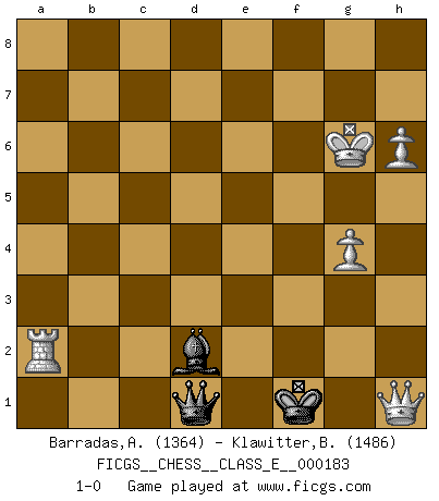 Last move : 1-0 2015 December 30 21:27:26 [Event "FICGS__CHESS__CLASS_E__000183"] [Site "FICGS"] [Date "2015.10.31"] [Round "1"] [White "Barradas,Anderson"] [Black "Klawitter,Bernd"] [Result "1-0"] [WhiteElo "1364"] [BlackElo "1486"] 1.e4 e5 2.Nf3 Nf6 3.Nxe5 d6 4.Bb5+ c6 5.Nxc6 bxc6 6.Bd3 Be7 7.O-O O-O 8.Nc3 Nbd7 9.Ne2 a5 10.a4 Ba6 11.c4 Ne5 12.Qc2 Nxd3 13.Qxd3 c5 14.Nf4 Nd7 15.b3 Bf6 16.Rb1 Ne5 17.Qg3 Bc8 18.Nd5 Bh4 19.Qe3 Ng4 20.Qe2 Ne5 21.g3 Be7 22.Kg2 Bb7 23.d3 Bxd5 24.exd5 Bf6 25.f4 Ng6 26.Be3 Qd7 27.h3 Rfe8 28.Qf3 Qf5 29.Bd2 Bd4 30.Rh1 Re7 31.h4 Rae8 32.Rbe1 Rxe1 33.Bxe1 Re3 34.Qf1 Qxd3 35.Qxd3 Rxd3 36.Bxa5 Ne7 37.Bd8 Nc8 38.Re1 Re3 39.Rb1 Bc3 40.Kf2 Re8 41.Bc7 Bb4 42.a5 Re7 43.Bd8 Rd7 44.Bb6 Nxb6 45.axb6 Rb7 46.Ra1 h5 47.Ra6 Kh7 48.Kf3 f5 49.Kg2 Kg6 50.Kf3 Bc3 51.Kg2 Bf6 52.Kf3 Bd8 53.Kg2 Bxb6 54.Kf3 Bc7 55.Ra3 Bb8 56.Kg2 Re7 57.Kf3 Kf6 58.Ra6 g6 59.Rb6 Re8 60.b4 cxb4 61.Rxb4 Ba7 62.Ra4 Bc5 63.Kg2 Ke7 64.Ra2 Kd7 65.Rb2 Kc7 66.Kh3 Re4 67.Rc2 Kb6 68.Rb2+ Ka5 69.Rb8 Rxc4 70.Rg8 Rd4 71.Rxg6 Rxd5 72.Rg5 Rd3 73.Rxf5 Kb4 74.Rxh5 Bf2 75.Rg5 Kc4 76.h5 d5 77.h6 Bd4 78.Rg4 Rd1 79.Kg2 Rd2+ 80.Kh3 Rd1 81.Kh4 Bf6+ 82.Kh5 Bc3 83.Kg6 Kd3 84.f5 Rf1 85.Rf4 Rh1 86.g4 Ke3 87.Ra4 d4 88.f6 d3 89.f7 d2 90.f8Q d1Q 91.Qf4+ Ke2 92.Ra2+ Bd2 93.Qe4+ Kf1 94.Qxh1+ 1-0 Petrov's defense Kingside Castling by player White (move 7) Kingside Castling by player Black (move 7) 10 pieces endgame at move 73 : White KRPPP , Black KRBPP WHITE : King + 1 Rook 3 Pawns BLACK : King + 1 Rook 1 Bishop 2 Pawns 9 pieces endgame at move 74 : White KRPPP , Black KRBP WHITE : King + 1 Rook 3 Pawns BLACK : King + 1 Rook 1 Bishop 1 Pawn Promotion Queen by player White (move 90) Promotion Queen by player Black (move 90) 8 pieces endgame at move 94 : White KQRPP , Black KQB WHITE : King + 1 Queen 1 Rook 2 Pawns BLACK : King + 1 Queen 1 Bishop Player White won this chess game. Follow this game move after move (download)The most powerful weapon in Chess is to have the next move. (David Bronstein) Schach ist ein Teil der Kultur, und wenn es mit der Kultur abwärts geht, geht es auch mit dem Schach abwärts. (Mikhail Moiseyevich Botvinik) Si el Ajedrez es una ciencia, es la mas inexacta. Si el Ajedrez es un arte, es demasiado inexacto para ser visto como tal. Si el Ajedrez es un deporte, es demasiado esotérico. Si el Ajedrez es un juego, es demasiado exigente para ser solo un juego. Si el Ajedrez es una aventura, es una muy demandante. Si el Ajedrez es una pasión, es una muy gratificante. Si el Ajedrez es la vida, es una muy triste. (Anónimo) Echiquier : carré parfait, comme la Jérusalem nouvelle décrite par l'auteur de l'Apocalypse, huit cases sur huit, exaltation du chiffre 4, symbole du cosmos aux quatre horizons... où le noir et le blanc, l'ombre et la lumière, le mal et le bien s'entremêlent et se conjuguent. (Robert Couffignal, Le Gambit du poète) To steal ideas from one person is plagiarism. To steal from many is research. (Unknown)