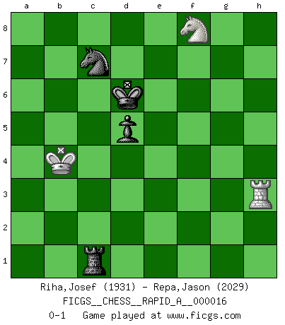 Last move : 0-1 2007 June 25 21:2:4 [Event "FICGS__CHESS__RAPID_A__000016"] [Site "FICGS"] [Date "2007.03.15"] [Round "1"] [White "Riha,Josef"] [Black "Repa,Jason"] [Result "0-1"] [WhiteElo "1931"] [BlackElo "2029"] 1.d4 e6 2.e4 d5 3.Nd2 Nf6 4.e5 Nfd7 5.Bd3 c5 6.c3 Nc6 7.Ne2 cxd4 8.cxd4 f6 9.exf6 Nxf6 10.Nf3 Bd6 11.O-O O-O 12.Bf4 Bxf4 13.Nxf4 Ne4 14.Qc1 Ng5 15.Nxg5 Qxg5 16.Ne2 Qf6 17.Qe3 Bd7 18.Bb5 Nb8 19.Bxd7 Nxd7 20.Rac1 Nb6 21.b3 Rf7 22.Qe5 Re8 23.Qxf6 Rxf6 24.Rc7 Rf7 25.Rfc1 Kf8 26.a4 Rxc7 27.Rxc7 Re7 28.Rc3 Kf7 29.Kf1 Nd7 30.h3 Nb8 31.f4 Nc6 32.g4 h6 33.Kf2 g6 34.h4 Ke8 35.Rc1 Kd7 36.Kf3 Kd6 37.Ke3 Rc7 38.Ng3 Rg7 39.Ne2 Ne7 40.Rg1 Rg8 41.Nc1 Rc8 42.Kd2 Nc6 43.Ne2 Rg8 44.Kd3 a6 45.Rh1 Ne7 46.Rg1 b6 47.Rg3 Rh8 48.Ng1 b5 49.axb5 axb5 50.Nf3 Rf8 51.Ke3 h5 52.Ne5 hxg4 53.Rxg4 Nf5+ 54.Kd2 b4 55.Nf3 Rc8 56.Rxg6 Rc3 57.Ng5 Nxd4 58.Nxe6 Nf3+ 59.Kd1 Nxh4 60.Rh6 Nf5 61.Rg6 Ke7 62.Ng5 Nd4 63.Rb6 Rxb3 64.Nh7 Rd3+ 65.Kc1 Rf3 66.Rxb4 Rxf4 67.Kd1 Rf1+ 68.Kd2 Ne6 69.Rh4 Rf2+ 70.Ke3 Rf5 71.Rh6 Kf7 72.Kd2 Nc5 73.Ke3 Kg7 74.Rc6 Nb3 75.Rc7+ Kg6 76.Kd3 Rf3+ 77.Kc2 Nd4+ 78.Kd2 Rg3 79.Nf8+ Kf5 80.Rf7+ Ke5 81.Re7+ Kd6 82.Re3 Rg1 83.Kc3 Nb5+ 84.Kb4 Nc7 85.Rh3 Rc1 0-1 Queen's pawn Kingside Castling by player White (move 11) Kingside Castling by player Black (move 11) 10 pieces endgame at move 59 : White KRNPP , Black KRNPP WHITE : King + 1 Rook 1 Knight 2 Pawns BLACK : King + 1 Rook 1 Knight 2 Pawns 9 pieces endgame at move 63 : White KRNP , Black KRNPP WHITE : King + 1 Rook 1 Knight 1 Pawn BLACK : King + 1 Rook 1 Knight 2 Pawns 8 pieces endgame at move 66 : White KRNP , Black KRNP WHITE : King + 1 Rook 1 Knight 1 Pawn BLACK : King + 1 Rook 1 Knight 1 Pawn 7 pieces endgame at move 66 : White KRN , Black KRNP WHITE : King + 1 Rook 1 Knight BLACK : King + 1 Rook 1 Knight 1 Pawn Player Black won this chess game. Follow this game move after move (download)Fischer, who may or may not be mad as a hatter, has every right to be horrified. (Jeremy Silman) Ein Springer auf f6 gegen die eigene Rochadestellung ist schlimmer als ein rostiger Nagel im Knie. (Efim Bogoljubov) El Ajedrez es de 30 a 40 por ciento psicología. Uno no cuenta con esto cuando se juega contra una computadora. No lo puedo confundir. (Judith Polgar) On entre au jeu d'Echecs comme on entre en Religion. Pour le joueur d'Echecs, la partie d'Echecs c'est l'office, la messe, le défilé du 1er Mai, le dépôt de gerbe au Monument aux Morts. C'est un drame sacré. (Michel Roos) Memory is a complicated thing, a relative to truth, but not its twin. (Barbara Kingsolver, Animal Dreams)