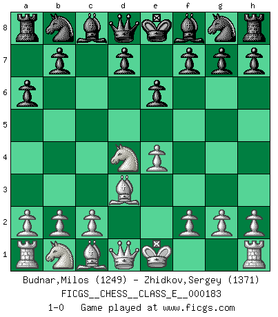 Last move : 1-0 2015 December 14 20:54:14 [Event "FICGS__CHESS__CLASS_E__000183"] [Site "FICGS"] [Date "2015.10.31"] [Round "1"] [White "Budnar,Milos"] [Black "Zhidkov,Sergey"] [Result "1-0"] [WhiteElo "1249"] [BlackElo "1371"] 1.e4 c5 2.Nf3 e6 3.d4 cxd4 4.Nxd4 a6 5.Bd3 1-0 This chess game has been lost on time (started : 2015.10.31 23:51:55) Sicilian : Kan, 5.Bd3 Player White won this chess game. Follow this game move after move (download)It is peculiar but a fact nevertheless, that gamblers in chess always have enthusiastic followers. (Botvinnik) Garry Kasparov war erst in der Großmeister-Organisation GMA, dann in der Profischach-Vereinigung PCA, zum Schluss kehrte er wieder in den Schoß der FIDE zurück. Aber gut, manche Leute sind flexibel (Viswanathan Anand) Por esta medida (el intervalo entre Fischer y sus contemporaneos), yo le considero el mas grande campeón mundial. (Garry Kasparov) RxDa4 pat (...) He who fights with monsters should be careful lest he thereby become a monster. (Friedrich Nietzsche, Beyond Good and Evil)