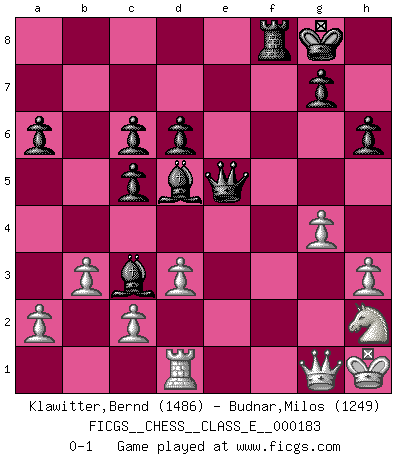 Last move : 0-1 2015 December 20 17:53:1 [Event "FICGS__CHESS__CLASS_E__000183"] [Site "FICGS"] [Date "2015.10.31"] [Round "1"] [White "Klawitter,Bernd"] [Black "Budnar,Milos"] [Result "0-1"] [WhiteElo "1486"] [BlackElo "1249"] 1.e4 e5 2.Nf3 Nc6 3.Bb5 a6 4.Ba4 Nf6 5.d3 d6 6.Bxc6+ bxc6 7.h3 h6 8.Nc3 Be7 9.O-O O-O 10.Be3 Be6 11.Qd2 Rb8 12.b3 c5 13.Nh2 c6 14.f4 exf4 15.Bxf4 Nh5 16.Qe2 Nxf4 17.Rxf4 Bf6 18.Qe1 Bd4+ 19.Kh1 Qg5 20.Rf3 Qe5 21.Qf1 Bxc3 22.Rd1 f5 23.exf5 Bxf5 24.g4 Be6 25.Rxf8+ Rxf8 26.Qg1 Bd5+ 0-1 Ruy Lopez : Anderssen variation Kingside Castling by player White (move 9) Kingside Castling by player Black (move 9) Player Black won this chess game. Follow this game move after move (download)Modern Chess is too much concerned with things like Pawn structure. Forget it, Checkmate ends the game. (Nigel Short) Schachspieler können ausgezeichnet Varianten am Schachbrett berechnen, aber nicht im realen Leben. Zu stark ist der Individualismus im Schach ausgeprägt, und für viele ist ein kleiner momentaner persönlicher Vorteil wichtiger als ein weit größerer Vorteil von morgen. (Anatoly Karpov) ¿Que sería del Ajedrez sin errores graciosos?. (Kurt Richter) Les Echecs représentent une sphère d'idées créatrices basée sur la volonté des deux protagonistes. (Smyslov) He who defends everything defends nothing. (Frederick the Great)