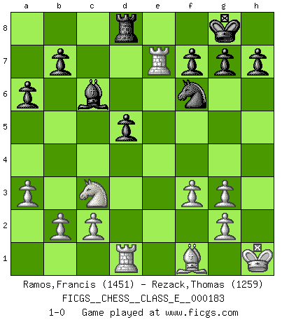 Last move : 1-0 2015 December 15 12:37:40 [Event "FICGS__CHESS__CLASS_E__000183"] [Site "FICGS"] [Date "2015.10.31"] [Round "1"] [White "Ramos,Francis"] [Black "Rezack,Thomas"] [Result "1-0"] [WhiteElo "1451"] [BlackElo "1259"] 1.e4 c5 2.Nf3 d6 3.d4 cxd4 4.Nxd4 Nf6 5.Nc3 a6 6.Be3 e6 7.f3 Be7 8.Be2 O-O 9.Qd2 Bd7 10.O-O Nc6 11.Rad1 Qc7 12.a3 Rac8 13.Kh1 Nxd4 14.Bxd4 Rfd8 15.Qe1 Bc6 16.Qf2 d5 17.Bb6 Qe5 18.Bxd8 Rxd8 19.exd5 exd5 20.Rfe1 Qf4 21.Bf1 Ng4 22.Qg3 Qxg3 23.hxg3 Nf6 24.Rxe7 1-0 Sicilian : Najdorf, Byrne (English) attack Kingside Castling by player Black (move 8) Kingside Castling by player White (move 10) Player White won this chess game. Follow this game move after move (download)One of these modest little moves may be more embarrassing to your opponent than the biggest threat. (Siegbert Tarrasch) Ein guter Spieler hat immer Glück. (José Raúl Capablanca) La táctica fluye a partir de una posición superior. (Bobby Fischer) En blitz, le Cavalier l'emporte sur le Fou. (Vlastimil Hort) My poor ole parrot... Is not in the circulation of displays ....poo hoo hoo :) (Wayne Lowrance's enigma)