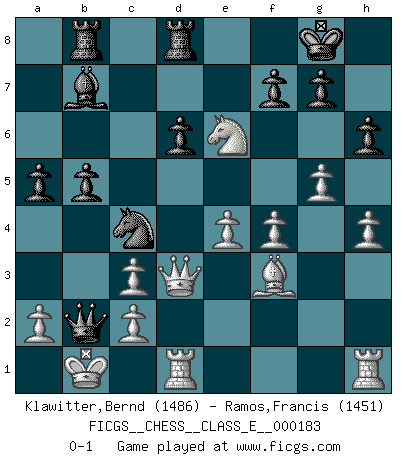 Last move : 0-1 2015 November 24 15:3:22 [Event "FICGS__CHESS__CLASS_E__000183"] [Site "FICGS"] [Date "2015.10.31"] [Round "1"] [White "Klawitter,Bernd"] [Black "Ramos,Francis"] [Result "0-1"] [WhiteElo "1486"] [BlackElo "1451"] 1.e4 c5 2.Nf3 d6 3.d4 cxd4 4.Nxd4 Nf6 5.Nc3 a6 6.Be2 e6 7.Bg5 Be7 8.Qd3 O-O 9.f4 Qc7 10.O-O-O Nc6 11.Nb3 Rd8 12.Bf3 Rb8 13.Qe2 b5 14.g4 Bb7 15.h4 h6 16.Bxf6 Bxf6 17.g5 Bxc3 18.bxc3 Na5 19.Qe3 Nc4 20.Qd3 a5 21.Nd4 Qc5 22.Nxe6 Qa3+ 23.Kb1 Qb2+ 0-1 Sicilian : Najdorf, Opovcensky variation Kingside Castling by player Black (move 8) Queenside Castling by player White (move 10) Player Black won this chess game. Follow this game move after move (download)There are two classes of men; those who are content to yield to circumstances and who play whist; those who aim to control circumstances, and who play Chess. (Mortimer Collins) Du musst nicht gut spielen, es reicht, wenn du besser spielst als dein Gegner. (Anonymous) Entre mas años cumplo, mas valoro los Peones. (Keres) Les Echecs ne sont pas pour les âmes timides. Ils requièrent un homme entier, qui ne s'arrête pas aveuglément à ce qui a été déjà établi, mais qui tente individuellement de sonder les profondeurs du jeu. (W. Steinitz) I believe in luck. How else can you explain the success of those you dislike ? (Jean Cocteau)