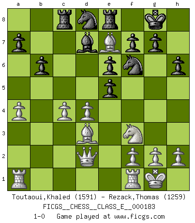 Last move : 1-0 2016 January 9 13:28:34 [Event "FICGS__CHESS__CLASS_E__000183"] [Site "FICGS"] [Date "2015.10.31"] [Round "1"] [White "Toutaoui,Khaled"] [Black "Rezack,Thomas"] [Result "1-0"] [WhiteElo "1591"] [BlackElo "1259"] 1.d4 Nf6 2.c4 e6 3.Nc3 Bb4 4.Nf3 Bxc3+ 5.bxc3 h6 6.a4 O-O 7.e3 Qe7 8.Ba3 d6 9.c5 Re8 10.cxd6 cxd6 11.Bd3 Bd7 12.c4 Nc6 13.O-O Rac8 14.Qd2 Nd8 15.e4 b6 16.e5 dxe5 17.Bxe7 1-0 Nimzo-Indian : Three knights variation Kingside Castling by player Black (move 6) Kingside Castling by player White (move 13) Player White won this chess game. Follow this game move after move (download)By playing at Chess then, we may learn: First: Foresight... Second: Circumspection... Third: Caution... And lastly, we learn by Chess the habit of not being discouraged by present bad appearances in the state of our affairs, the habit of hoping for a favorable chance, and that of persevering in the secrets of resources. (Benjamin Franklin) Es ist besser die Steine des Gegners zu opfern. (Savielly Grigorievitsch Tartakower) La vida es como el Ajedrez, con lucha, competición y eventos buenos y malos. (Benjamin Franklin) Fischer est le meilleur joueur du monde et Karpov n'est qu'un joueur de bistrot. (Garry Kasparov, agé de 16 ans) Are you threatening me, Master Jedi ? (Chancellor Palpatine in Star Wars ep.3)