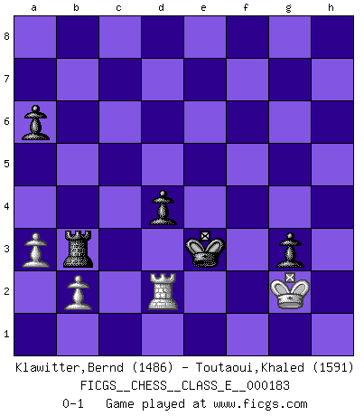 Last move : 0-1 2016 August 17 8:6:50 [Event "FICGS__CHESS__CLASS_E__000183"] [Site "FICGS"] [Date "2015.10.31"] [Round "1"] [White "Klawitter,Bernd"] [Black "Toutaoui,Khaled"] [Result "0-1"] [WhiteElo "1486"] [BlackElo "1591"] 1.e4 e5 2.Nf3 Nc6 3.Bb5 d6 4.d4 a6 5.Bxc6+ bxc6 6.dxe5 Bg4 7.Nc3 d5 8.exd5 Bb4 9.h3 Bxf3 10.Qxf3 cxd5 11.Bd2 c6 12.O-O Ne7 13.a3 Bxc3 14.Bxc3 O-O 15.Rad1 Ng6 16.Qg3 Re8 17.Kh1 Qc7 18.f4 Re7 19.h4 Rd8 20.h5 Nh8 21.e6 g6 22.Bf6 Rxe6 23.Bxd8 Qxd8 24.f5 Rd6 25.fxg6 fxg6 26.h6 Nf7 27.Qf4 Rd7 28.Qh2 Qg5 29.Rxf7 Rxf7 30.Re1 Rf4 31.Kg1 Qg4 32.Re8+ Kf7 33.Re2 g5 34.Re1 Qh4 35.Qxh4 Rxh4 36.Re3 Rxh6 37.Kf2 Rf6+ 38.Kg3 h5 39.c3 Re6 40.Rf3+ Rf6 41.Re3 Rf4 42.Re2 h4+ 43.Kh2 Re4 44.Rf2+ Kg6 45.g3 Kh5 46.gxh4 Kxh4 47.Kg2 Rf4 48.Re2 Re4 49.Rf2 g4 50.Rd2 Re3 51.Rf2 Kg5 52.Rd2 Rh3 53.Re2 Kf5 54.Re8 Kf4 55.Re6 Rd3 56.Re2 c5 57.Kf2 g3+ 58.Kg2 d4 59.cxd4 cxd4 60.Rc2 Rb3 61.Rd2 Ke3 0-1 Ruy Lopez : Old Steinitz defense Kingside Castling by player White (move 12) Kingside Castling by player Black (move 14) 10 pieces endgame at move 59 : White KRPPP , Black KRPPP WHITE : King + 1 Rook 3 Pawns BLACK : King + 1 Rook 3 Pawns 9 pieces endgame at move 59 : White KRPP , Black KRPPP WHITE : King + 1 Rook 2 Pawns BLACK : King + 1 Rook 3 Pawns Player Black won this chess game. Follow this game move after move (download)Chess is a matter of delicate judgment, knowing when to punch and how to duck. (Bobby Fischer) Ich erzeugte keinen Neid, da mich die Schachspieler als Musiker und die Musiker als Schachspieler betrachteten. (Mark Taimanov) La batalla por la última verdad nunca sera ganada. Y es por eso que el Ajedrez es tan fascinante. (Hans Kmoch) Avec des compensations pour le matériel en plus... (Anonyme) No, I am still playing. (Anatoly Karpov)