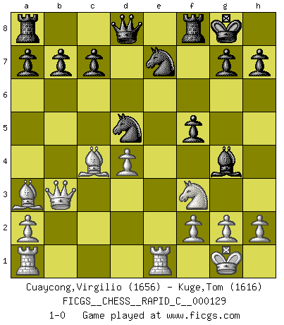 Last move : 1-0 2015 December 4 16:27:6 [Event "FICGS__CHESS__RAPID_C__000129"] [Site "FICGS"] [Date "2015.11.01"] [Round "1"] [White "Cuaycong,Virgilio"] [Black "Kuge,Tom"] [Result "1-0"] [WhiteElo "1656"] [BlackElo "1616"] 1.e4 e5 2.Nf3 Nf6 3.Nxe5 d6 4.Nf3 Nxe4 5.d4 d5 6.Bd3 Nc6 7.O-O Bg4 8.Re1 f5 9.c4 Bb4 10.Nc3 O-O 11.cxd5 Bxc3 12.bxc3 Nxc3 13.Qb3 Nxd5 14.Bc4 Nce7 15.Ba3 1-0 Petrov : Classical attack Kingside Castling by player White (move 7) Kingside Castling by player Black (move 10) Player White won this chess game. Follow this game move after move (download)A great player and a great example for many. His book My 60 Memorable Games had a big impact on me. It is a shame he didn't continue to enrich the world of chess with his unparalleled understanding after 1972. (Jan Timman, about Bobby Fischer's death) Schach ist ein Teil der Kultur, und wenn es mit der Kultur abwärts geht, geht es auch mit dem Schach abwärts. (Mikhail Moiseyevich Botvinik) Si el Ajedrez es una ciencia, es la mas inexacta. Si el Ajedrez es un arte, es demasiado inexacto para ser visto como tal. Si el Ajedrez es un deporte, es demasiado esotérico. Si el Ajedrez es un juego, es demasiado exigente para ser solo un juego. Si el Ajedrez es una aventura, es una muy demandante. Si el Ajedrez es una pasión, es una muy gratificante. Si el Ajedrez es la vida, es una muy triste. (Anónimo) Les échecs, c'est l'imagination. (David Bronstein) To err is human, to shift the blame on someone else is tactical. (Mladen Jankovic)