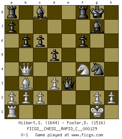 Last move : 0-1 2015 November 16 17:5:8 [Event "FICGS__CHESS__RAPID_C__000129"] [Site "FICGS"] [Date "2015.11.01"] [Round "1"] [White "Hilbert,Stephan J."] [Black "Foster,Duncan"] [Result "0-1"] [WhiteElo "1644"] [BlackElo "1516"] 1.e4 b6 2.Nc3 Bb7 3.Bc4 e6 4.d3 g6 5.Bd2 Bg7 6.Nge2 h6 7.O-O Ne7 8.f4 O-O 9.Ng3 d5 10.Bb3 c6 11.f5 exf5 12.exf5 Nc8 13.Qg4 h5 14.Nxh5 gxh5 15.Qxh5 f6 16.Rf3 Qe8 17.Qg4 Nd7 18.Rh3 Ne5 19.Qg3 Ne7 20.Bh6 Nxf5 21.Qf2 Nxh6 22.Ne2 Bc8 23.Re3 Nhg4 24.Qg3 Nxe3 25.Qxe3 Qg6 26.Nf4 Qg5 27.Qf2 Ng4 28.Qd4 Qe5 29.Qb4 Qe3+ 0-1 Owen defense Kingside Castling by player White (move 7) Kingside Castling by player Black (move 8) Player Black won this chess game. Follow this game move after move (download)Bobby just drops the pieces and they fall on the right squares. (Miguel Najdorf) Frage: Wie viele Autos haben Sie schon zerstört? - Antwort: Nur zwei. (Loek van Wely) De todos mis libros Rusos, la defensa contiene y difunde el 'calor' mas grande que pudiese verse extraño al observar lo supremamente abstracto que el Ajedrez supuestamente es. (Vladimir Nabokov) Soyez une menace à chaque fois que vous vous asseyez pour jouer. (Ken Smith) Wisdom doesn't necessarily come with age. Sometimes age just shows up all by itself. (Tom Watson)