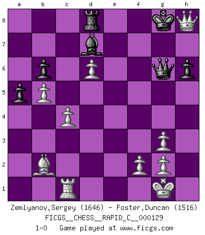 Last move : 1-0 2016 January 20 15:40:32 [Event "FICGS__CHESS__RAPID_C__000129"] [Site "FICGS"] [Date "2015.11.01"] [Round "1"] [White "Zemlyanov,Sergey"] [Black "Foster,Duncan"] [Result "1-0"] [WhiteElo "1646"] [BlackElo "1516"] 1.d4 b6 2.e4 Bb7 3.Bd3 e6 4.Nf3 h6 5.Qe2 g6 6.a4 a6 7.c4 d6 8.a5 Nd7 9.Nc3 Bg7 10.axb6 cxb6 11.O-O Ne7 12.d5 e5 13.b4 Rc8 14.Ba3 O-O 15.b5 a5 16.Bxd6 Re8 17.Rfc1 Nf5 18.exf5 e4 19.fxg6 f5 20.Ba3 exd3 21.Qxd3 Qf6 22.Ra2 Qxg6 23.Re2 Rxe2 24.Nxe2 Ne5 25.Nxe5 Bxe5 26.Ng3 Re8 27.d6 Rd8 28.Qe3 f4 29.Qxe5 fxg3 30.hxg3 Bc8 31.Bb2 Bd7 32.Qh8+ 1-0 Queen's pawn : English defense Kingside Castling by player White (move 11) Kingside Castling by player Black (move 14) Player White won this chess game. Follow this game move after move (download)Chess is a part of culture and if a culture is declining then Chess too will decline. (Mikhail Botvinnik) Unter Putin wird alles Geld aus Russland wie von einem Staubsauger nach Moskau umgeleitet, das ist wie ein schwarzes Loch. (Garry Kasparov) Para mi, el Ajedrez es la vida y cada partida es como una nueva vida. Todo jugador de Ajedrez suele vivir muchas vidas durante su vida. (Eduard Gufeld) J'apprécie les joueurs d'est-indienne, c'est grâce à eux que je nourris ma famille depuis tant d'années. (Petrosian) If you don't practice you don't deserve to win. (Andre Agassi)
