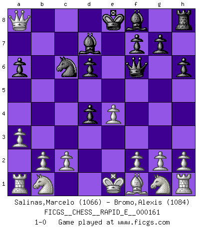 Last move : 1-0 2015 December 11 6:19:52 [Event "FICGS__CHESS__RAPID_E__000161"] [Site "FICGS"] [Date "2015.11.02"] [Round "1"] [White "Salinas,Marcelo"] [Black "Bromo,Alexis"] [Result "1-0"] [WhiteElo "1066"] [BlackElo "1084"] 1.e4 e5 2.Qf3 Nf6 3.a3 a6 4.d4 d6 5.Bg5 h6 6.Bxf6 Qxf6 7.Qc3 exd4 8.Qxc7 Bd7 9.Qxb7 Nc6 10.Qxa8+ 1-0 Variation Napoleon's Opening : Napoleon's Opening Player White won this chess game. Follow this game move after move (download)A strong memory, concentration, imagination, and a strong will is required to become a great Chess player. (Bobby Fischer) Sie bekommen vielleicht den Eindruck, dass die Spitzenspieler überhaupt gar nicht so stark sind. Aber das stimmt nicht. Es ist eine Illusion. Mit einem Computer an der Seite ist es sehr leicht, Urteile zu fällen, aber wenn man alleine am Brett sitzt, sieht die Sache ganz anders aus. (Vladimir Kramnik) El Ajedrez es el gimnasio de la mente. (Blaise Pascal) On peut tirer plus d'utilité d'une partie perdue que de 100 parties gagnées. (Capablanca) Man is still the most extraordinary computer of all. (John F. Kennedy)