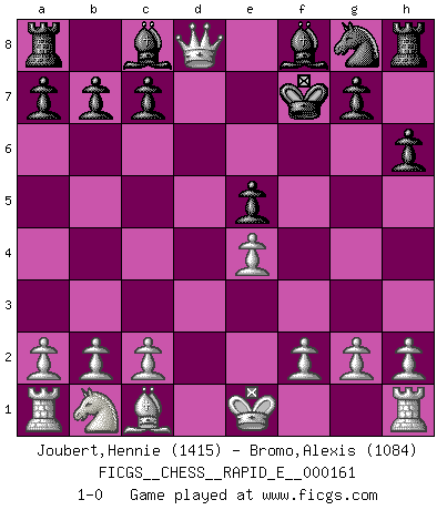 Last move : 1-0 2015 November 6 19:6:39 [Event "FICGS__CHESS__RAPID_E__000161"] [Site "FICGS"] [Date "2015.11.02"] [Round "1"] [White "Joubert,Hennie"] [Black "Bromo,Alexis"] [Result "1-0"] [WhiteElo "1415"] [BlackElo "1084"] 1.e4 e5 2.Nf3 Nc6 3.Bc4 h6 4.d4 d6 5.dxe5 Nxe5 6.Nxe5 dxe5 7.Bxf7+ Kxf7 8.Qxd8 1-0 King's pawn game Player White won this chess game. Follow this game move after move (download)Avoid the crowd. Do your own thinking independently. Be the Chess player, not the Chess piece. (Ralph Charell) Modernes Schach erfordert enorme Anspannung. Es ist für einen normalen Menschen unmöglich das auszuhalten. (Viktor Kortschnoi) El juego de Damas es para vagabundos. (Paul Morphy) Des points faibles ou des trous dans la position de l'adversaire doivent être occupés par des pièces et non pas par des pions. (Siegbert Tarrasch) Work expands to fill the time available. (C. Northcote Parkinson, in Parkinson's Laws)