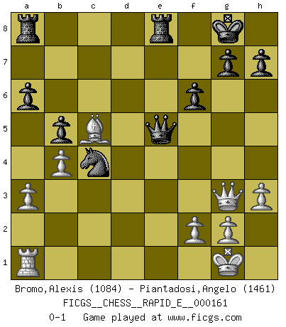 Last move : 0-1 2015 December 24 6:40:37 [Event "FICGS__CHESS__RAPID_E__000161"] [Site "FICGS"] [Date "2015.11.02"] [Round "1"] [White "Bromo,Alexis"] [Black "Piantadosi,Angelo"] [Result "0-1"] [WhiteElo "1084"] [BlackElo "1461"] 1.d4 d5 2.c4 e6 3.a3 dxc4 4.Nc3 Nf6 5.e3 c5 6.Bxc4 Nc6 7.Nf3 cxd4 8.exd4 Be7 9.O-O O-O 10.h3 a6 11.Re1 b5 12.Bb3 Bb7 13.d5 exd5 14.Nxd5 Nxd5 15.Bxd5 Na5 16.b4 Bxd5 17.Rxe7 Bxf3 18.Qxf3 Qxe7 19.Bb2 Nc4 20.Bd4 Rfe8 21.Qg3 f6 22.Bc5 Qe5 0-1 Queen's gambit declined Kingside Castling by player White (move 9) Kingside Castling by player Black (move 9) Player Black won this chess game. Follow this game move after move (download)Nonsense was the last thing Fischer was interested in, as far as Chess was concerned. (Elie Agur) Sie führen leise Selbstgespräche, schlürfen lautstark ihre Getränke, schmatzen hörbar beim Essen, blasen ihrem Gegenüber Rauch in die Augen, niesen ihm ins Gesicht, starren ihn unverwandt an, bis er sich unter ihren Blicken windet, rutschen ständig auf ihrem Stuhl hin und her, rülpsen und bohren in der Nase. (Anonymous) La belleza de un movimiento no se refleja solo en su apariencia, sino en el pensamiento detrás de él. (Siegbert Tarrasch) Un journaliste : 'Vous préférez avoir une dame de plus sur l'échiquier ou au lit ?' Boris Spassky : 'Ca dépend de la position.' Drag your thoughts away from your troubles... by the ears, by the heels, or any other way you can manage it. (Mark Twain)