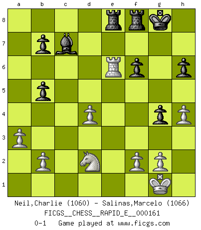Last move : 0-1 2016 January 6 1:5:15 [Event "FICGS__CHESS__RAPID_E__000161"] [Site "FICGS"] [Date "2015.11.02"] [Round "1"] [White "Neil,Charlie"] [Black "Salinas,Marcelo"] [Result "0-1"] [WhiteElo "1060"] [BlackElo "1066"] 1.Nf3 e6 2.e4 d6 3.d4 Nf6 4.Bg5 c5 5.dxc5 h6 6.Bh4 g5 7.Bg3 Nxe4 8.Bxd6 Nxd6 9.cxd6 Qxd6 10.Qxd6 Bxd6 11.Bd3 a6 12.O-O Nc6 13.Nc3 Nb4 14.a3 Nxd3 15.cxd3 Bd7 16.Rac1 Bb5 17.Nxb5 axb5 18.Rfe1 O-O 19.d4 f6 20.Rxe6 Bf4 21.Rc7 Bxc7 22.h4 g4 23.Nd2 Rae8 0-1 Reti Opening Kingside Castling by player White (move 12) Kingside Castling by player Black (move 18) Player Black won this chess game. Follow this game move after move (download)Daring ideas are like Chess men moved forward. They may be beaten, but they may start a winning game. (Johann Wolfgang von Goethe) Schach sollte überall auf der Welt Schulfach werden. Es fördert die geistige Auseinandersetzung. Es lehrt die Demut in der Niederlage. (Garry Kasparov) No puedes jugar al Ajedrez si eres de corazón noble. (Proverbio Francés) Je ne suis pas le dernier à jouer lâchement des coups douteux pendant le zeïtnot de l'adversaire pour l'achever: en effet les coups qui font le plus peur sont ceux que l'on ne comprend pas. Je me fais souvent peur quand je joue. (Un professeur anonyme) Chess, like love, like music, has the power to make people happy. (Siegbert Tarrasch)