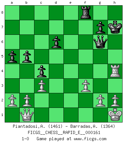 Last move : 1-0 2015 December 16 23:48:29 [Event "FICGS__CHESS__RAPID_E__000161"] [Site "FICGS"] [Date "2015.11.02"] [Round "1"] [White "Piantadosi,Angelo"] [Black "Barradas,Anderson"] [Result "1-0"] [WhiteElo "1461"] [BlackElo "1364"] 1.e4 e5 2.Nf3 Nc6 3.d4 exd4 4.Nxd4 Nxd4 5.Qxd4 b6 6.Nc3 Bb7 7.Be2 c5 8.Qd1 Nf6 9.f3 Be7 10.O-O O-O 11.Bc4 Bc6 12.Bf4 a6 13.Nd5 Nxd5 14.Bxd5 Bxd5 15.Qxd5 Bf6 16.c3 h6 17.Rad1 Ra7 18.e5 Bg5 19.Bxg5 hxg5 20.e6 fxe6 21.Qd6 Rf7 22.Qxe6 b5 23.Qd6 c4 24.Rfe1 Rf6 25.Qd5+ Kh7 26.Qxg5 Qb6+ 27.Kh1 Rg6 28.Qf5 Qf6 29.Qb1 a5 30.Rd4 d6 31.R1e4 Ra8 32.Rg4 Rf8 33.Rxg6 Qxg6 34.Rh4+ 1-0 Scotch game Kingside Castling by player White (move 10) Kingside Castling by player Black (move 10) Player White won this chess game. Follow this game move after move (download)Without error there can be no brilliancy. (Emanuel Lasker) Das Schachspiel ist ein See, in welchem eine Mücke baden und ein Elefant ertrinken kann. (Emanuel Lasker) Hasta este punto, las blancas han seguido un análisis bien conocido. Pero ahora el hace un error fatal: empieza a usar su propia cabeza. (Siegbert Tarrasch) Si le désir cupide (et stupide) de gagner est une inépuisable source de souffrance, une combinaison brillante sur l'échiquier est une découverte : le coquelicot qui s'épanouit lorsque apparaît la Voie Lactée. (Arrabal) The next best thing to gambling and winning is gambling and loosing. (Nick Dandalos)